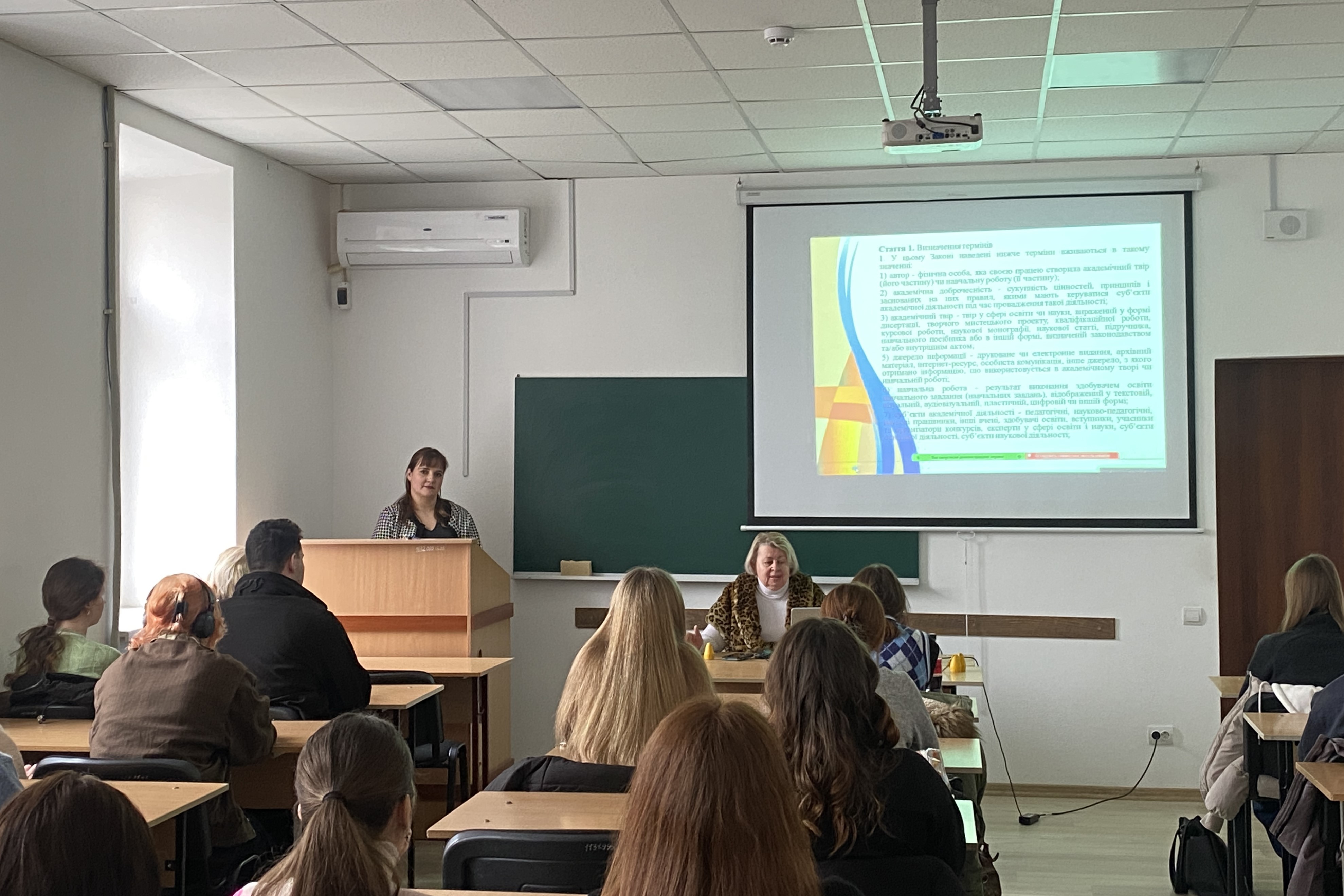 Студенти обговорили основні прояви академічної недоброчесності, зокрема плагіат, фабрикацію та фальсифікацію результатів, а також отримали практичні рекомендації щодо уникнення порушень. Особливу увагу було приділено формуванню культури цитування та правильному використанню джерел у наукових роботах.