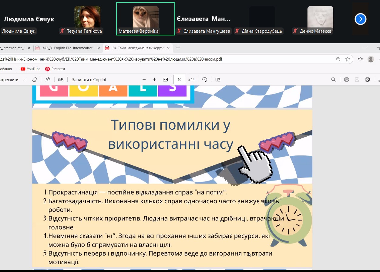Студентка четвертого курсу Вероніка Матвєєва представила доповідь «Тайм-менеджмент: як керувати не людьми, а часом». Учасники обговорили типові помилки у використанні часу та поділилися інструментами його ефективного управління.