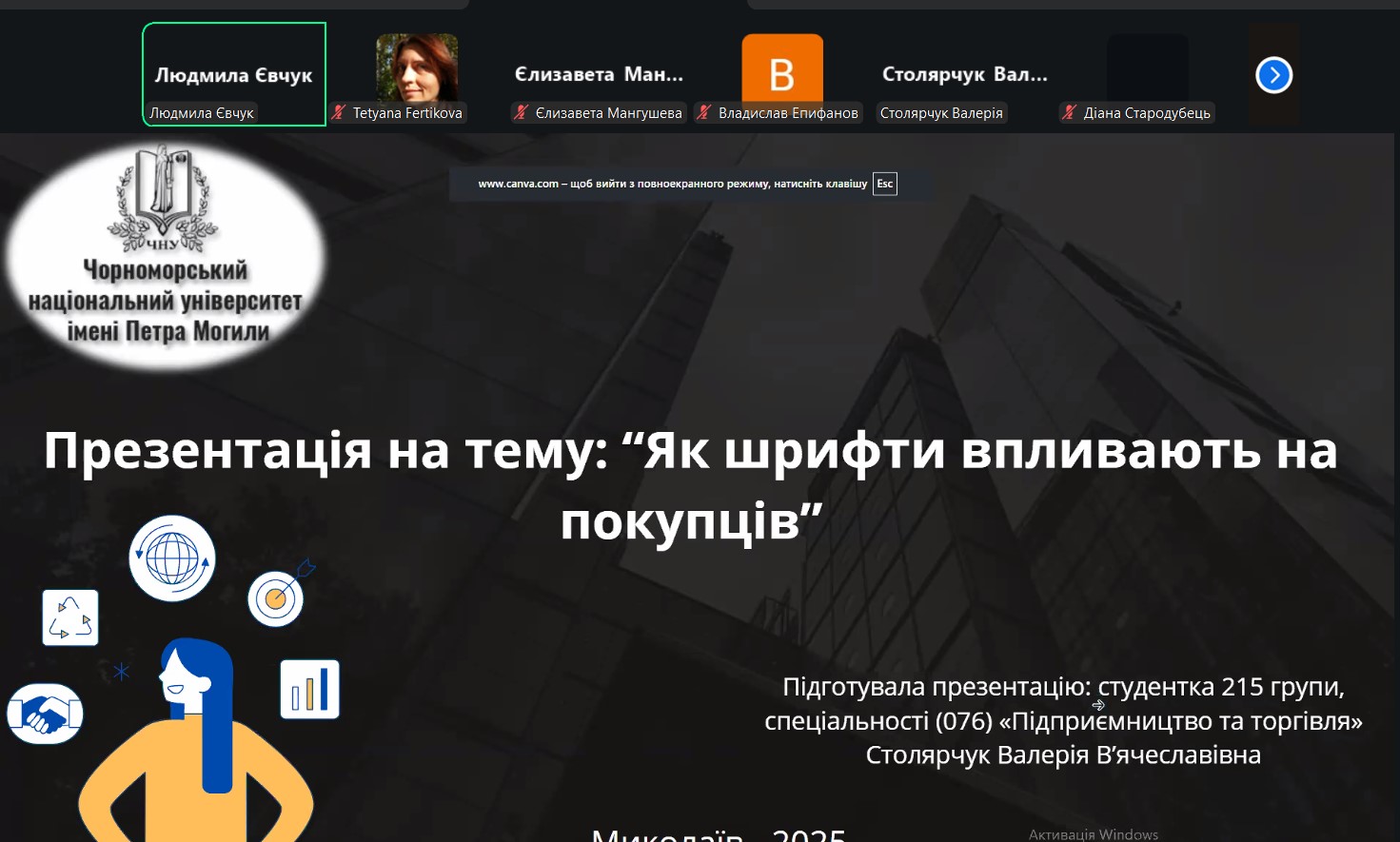 Викликав інтерес виступ студентки другого курсу Єлизавети Мангушевої на тему «Онлайн-школи: чи справді цей бізнес є перспективним?». Було відзначено, що ринок онлайн-освіти щороку зростає та трансформується – від довгих відеоматеріалів до коротких роликів тривалістю 2–3 хвилини. Студенти поділилися власним баченням і досвідом щодо онлайн-освіти. Водночас вони підкреслили, що університетське навчання має залишатися аудиторним, адже саме воно забезпечує живе спілкування з викладачами та студентами.