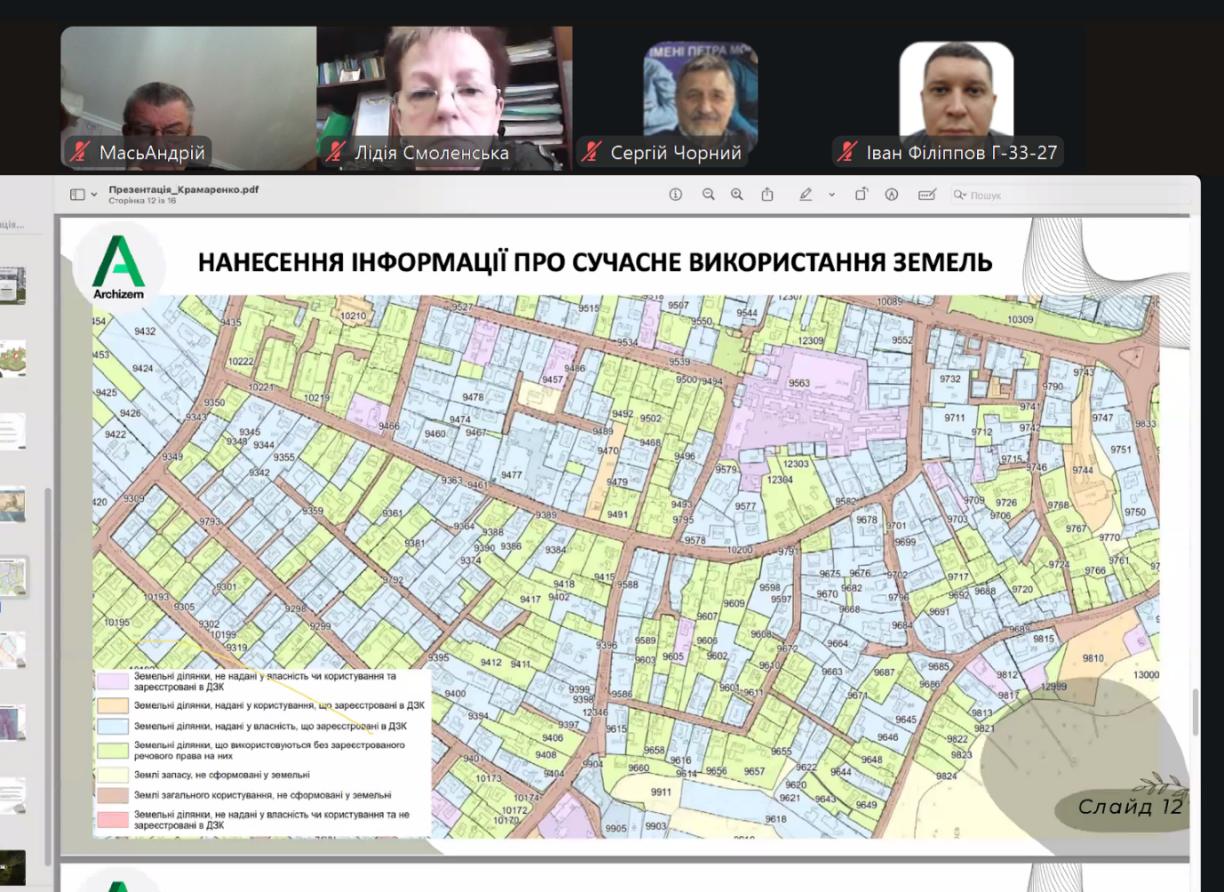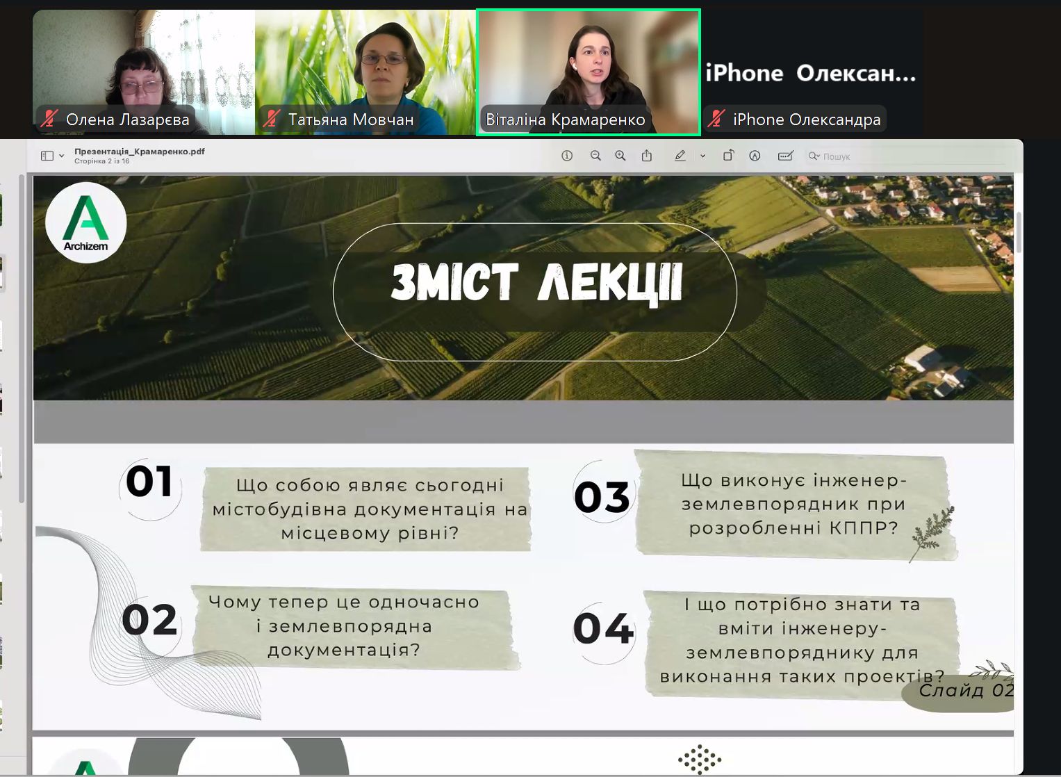 30 жовтня 2025 року викладачі кафедри управління земельними ресурсами – професори Сергій Чорний, Олена Лазарєва та старший викладач Андрій Мась – на запрошення кафедри геодезії, землеустрою та земельного кадастру Одеського державного аграрного університету разом зі студентами долучилися до онлайн-зустрічі з практиком землевпорядного виробництва – інженером-землевпорядником групи компаній «Архізем» Віталіною Крамаренко – на тему «Розроблення землевпорядної частини комплексних планів просторового розвитку територій територіальних громад».