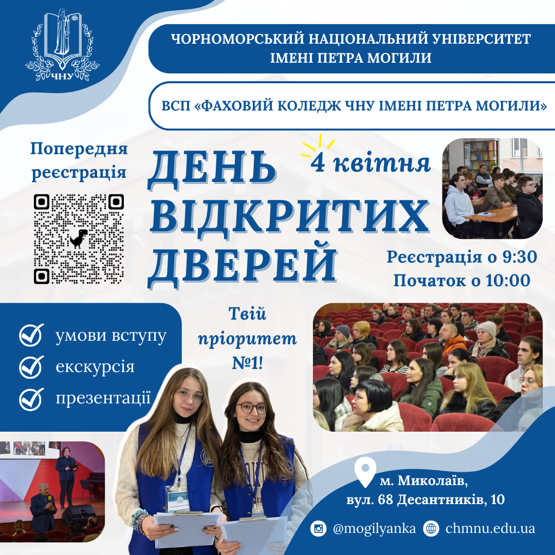 Чорноморський національний університет імені Петра Могили спільно з ВСП «Фаховий коледж ЧНУ імені Петра Могили» запрошує абітурієнтів на День відкритих дверей