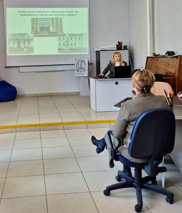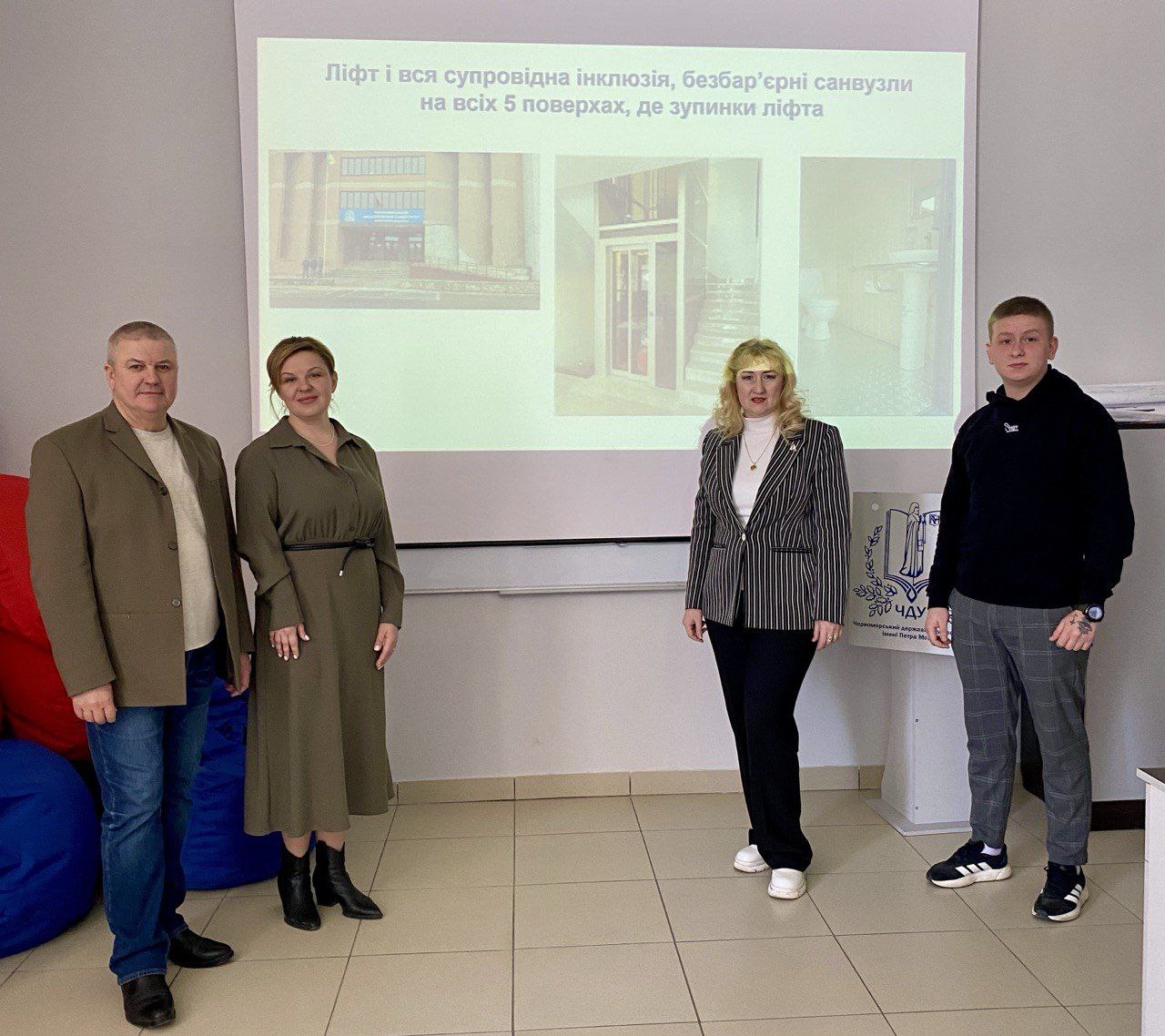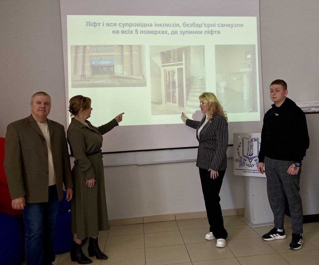 Завідувач кабінету соціально-психологічної підтримки Оксана Каменецька, завідувач кафедри психології Володимир Шевченко та практичний психолог кабінету Сергій Коновалов показали презентацію та представили бачення в.о.ректора ЧНУ імені Петра Могили Леоніда Клименко щодо реалізації великих архітектурних інклюзивних рішень, що ініціює наш університет і вже їх втілює спільно з іноземними партнерами та міжнародними організаціями.