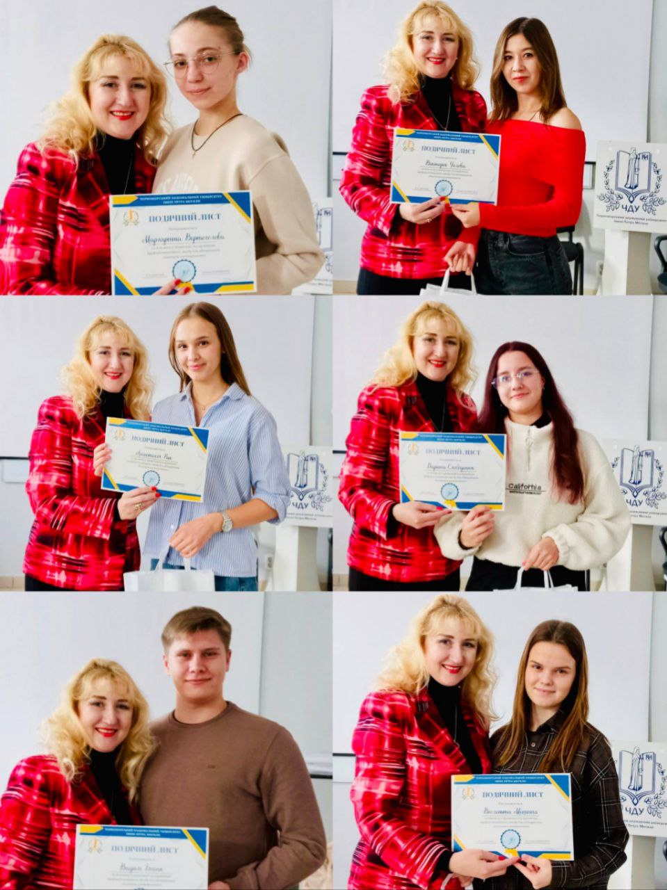 За дорученням в.о. ректора Леоніда Клименка завідувач кабінету Оксана Каменецька вручила студентам Подячні листи та цінні подарунки – ювілейне видання «Чорноморський державний університет імені Петра Могили», підготовлене до 20-річчя закладу, у якому відображено історію університету та його досягнення, а також блокнот для нотаток із фотографією головного корпусу ЧНУ імені Петра Могили.