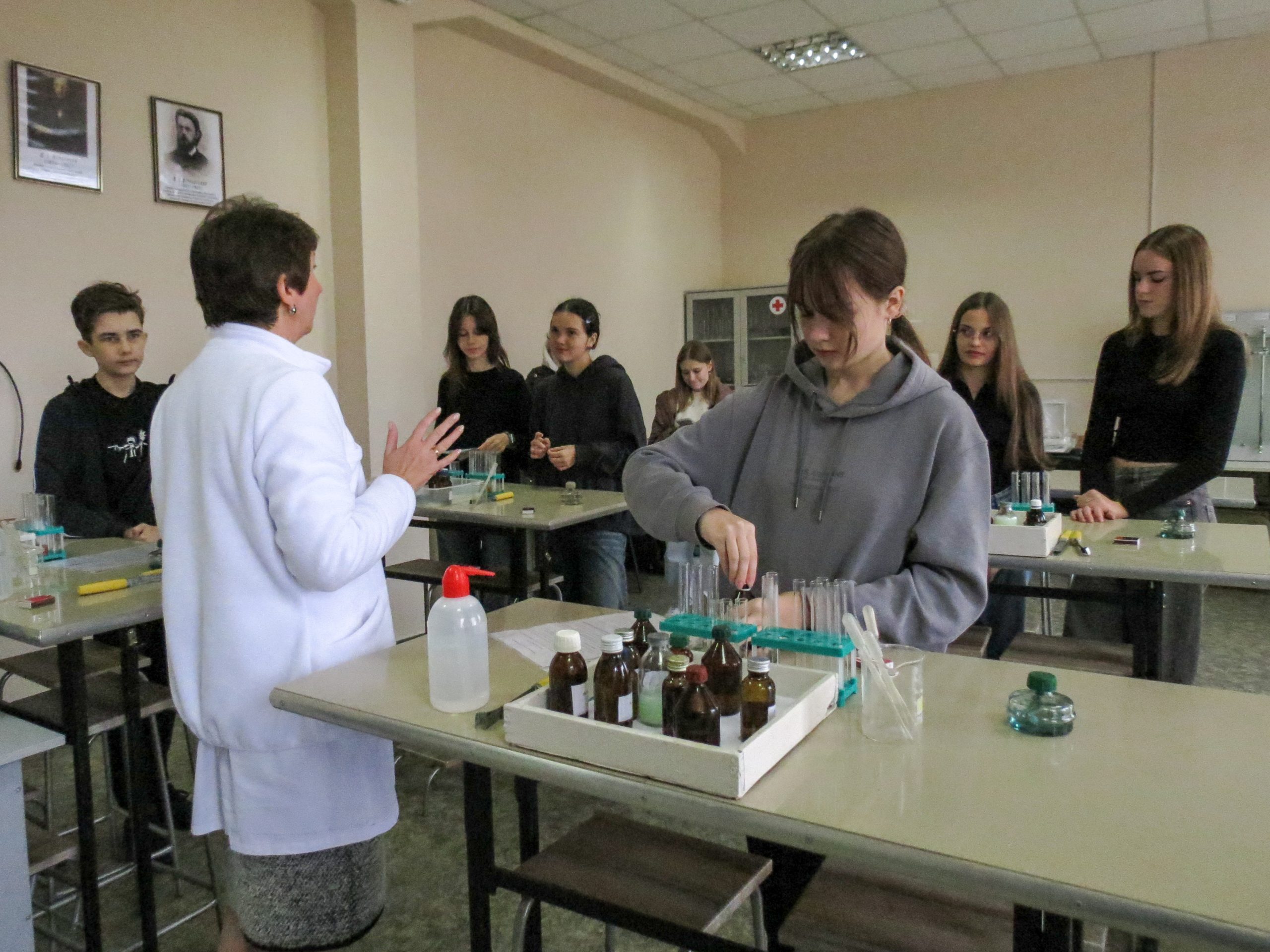 Відбувся також пізнавальний тренінг «Магія хімічних реакцій». Його метою було ознайомлення школярів з основами хімічного експерименту, формування практичних навичок роботи з реактивами та обладнанням, а також популяризація природничих наук. Під керівництвом викладачів учасники самостійно виконували якісні реакції на вуглеводи та білки, зокрема реакцію «срібного дзеркала», Троммера, на крохмаль і біуретову реакцію. Школярі не лише спостерігали, а й брали активну участь у дослідах, дізнаючись про хімічну суть реакцій та їх застосування в біології, медицині й фармації.