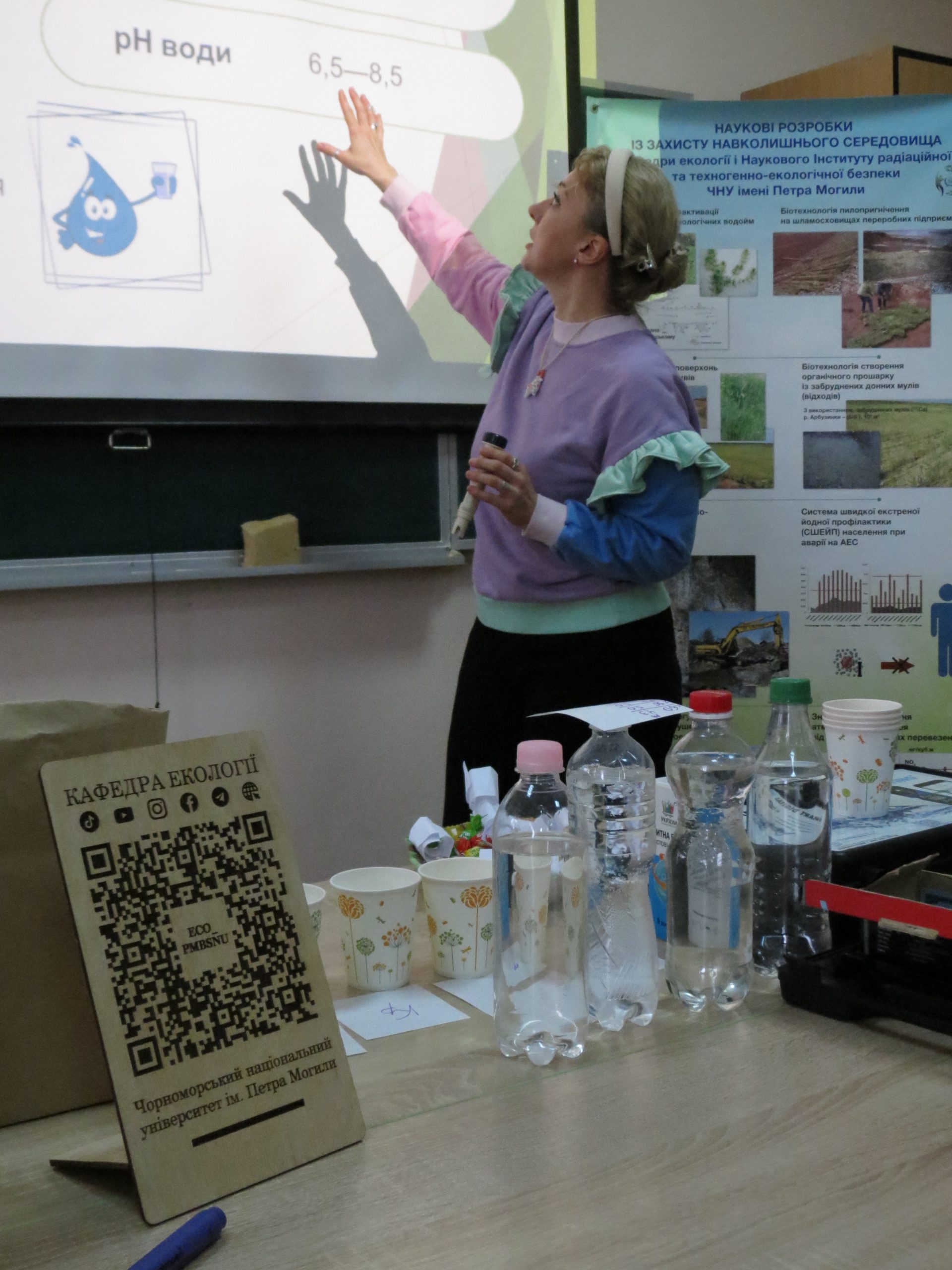 Кафедра екології провела майстер-клас «Якість довкілля: вода, повітря, продукти», де школярі ознайомилися з приладами для вимірювання електромагнітного випромінювання, освітленості та радіаційного фону. Учасники працювали з обладнанням, вивчали нормативні документи та аналізували реальні показники. Особливу зацікавленість викликав майстер-клас «У пошуках “живої” води», під час якого учні вимірювали рівень pH, порівнювали кислотність і лужність зразків, визначали рівень мінералізації та робили висновки щодо якості води. Практика перетворилася на захопливе дослідження, що пробудило екологічну свідомість, інтерес до науки та усвідомлення важливості контролю якості води, яку ми щодня споживаємо.