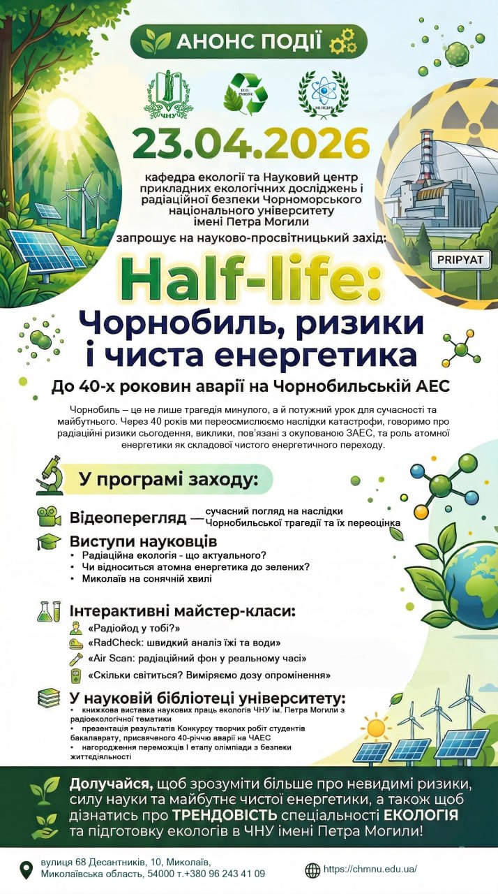 23 квітня 2026 року кафедра екології Чорноморського національного університету імені Петра Могили проведе захід «Half-life: Чорнобиль, ризики і чиста енергетика», присвячений 40-й річниці трагедії на ЧАЕС. Програма включатиме виступи науковців, інтерактивні майстер-класи та спеціальні заходи у науковій бібліотеці університету.
