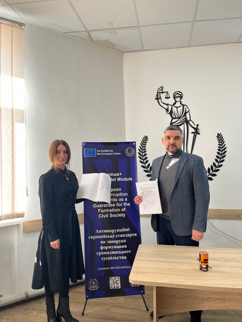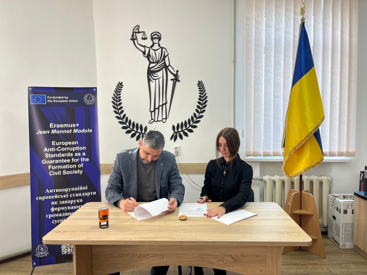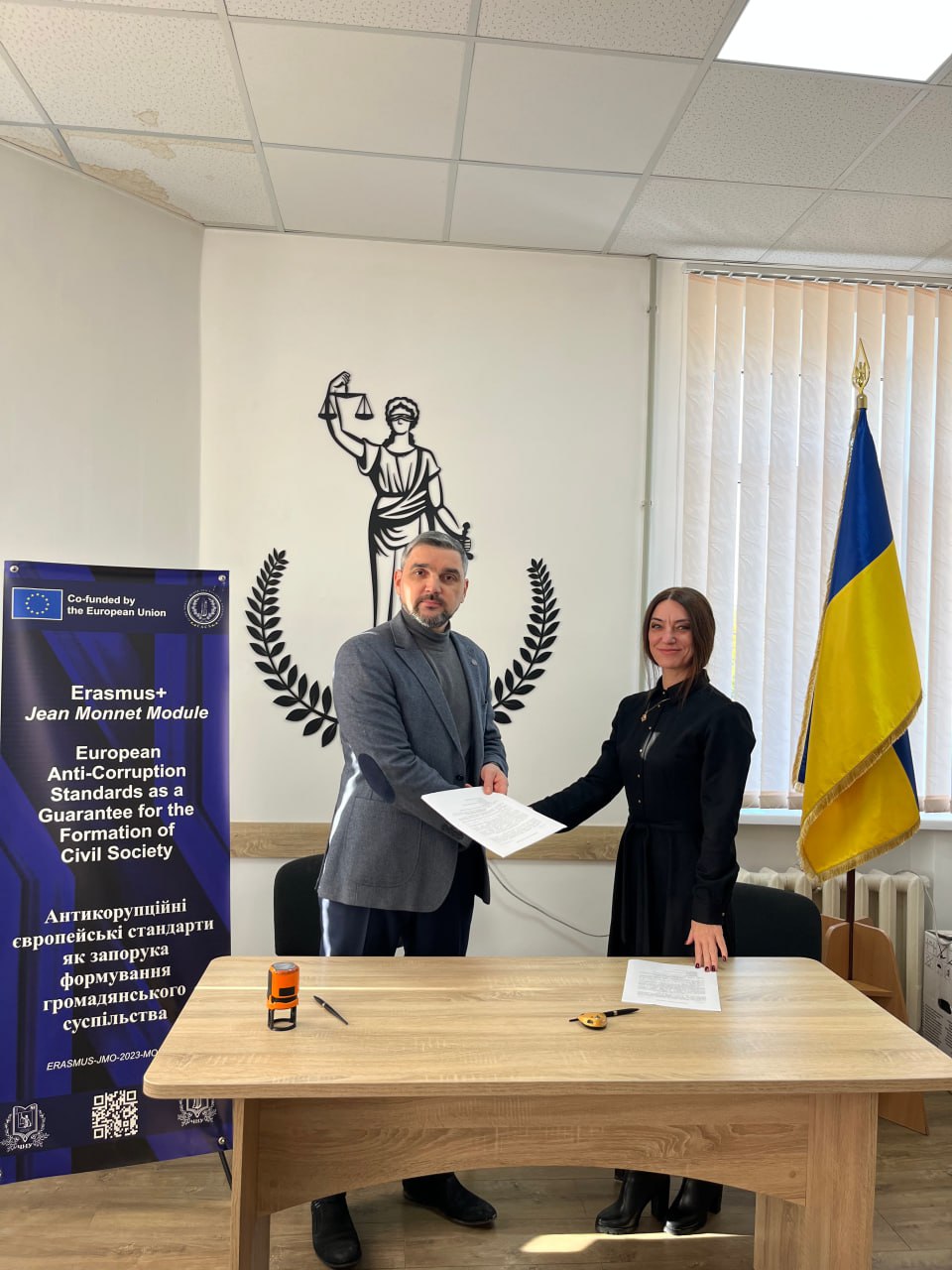 Traditionally, #ErasmusDays were celebrated at the Law Faculty of Petro Mohyla Black Sea National University as part of the Erasmus+ (ERASMUS Jean Monnet) project ‘European anti-corruption standards as a guarantee of civil society formation’. For the second consecutive year, we are celebrating these days by signing a Memorandum of Cooperation. The Dean of the Faculty, Dmytro Sichko, signed the Memorandum with Viktoria Kurian, the head of the NGO “Protection against Corruption”. The main goal of the NGO is to promote the dissemination of legal knowledge and legal culture, which is also the goal of the international project. The parties agreed to hold joint events on preventing corruption and forming high moral principles of integrity, justice, and impartiality, including during university students’ internships at the NGO.