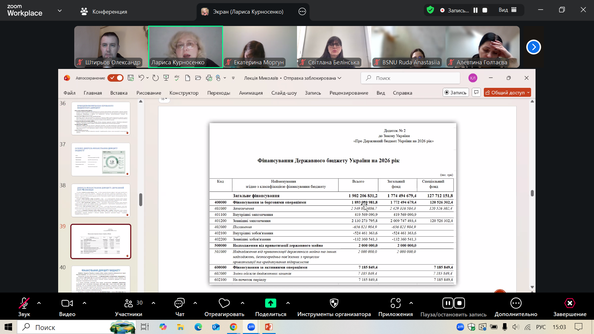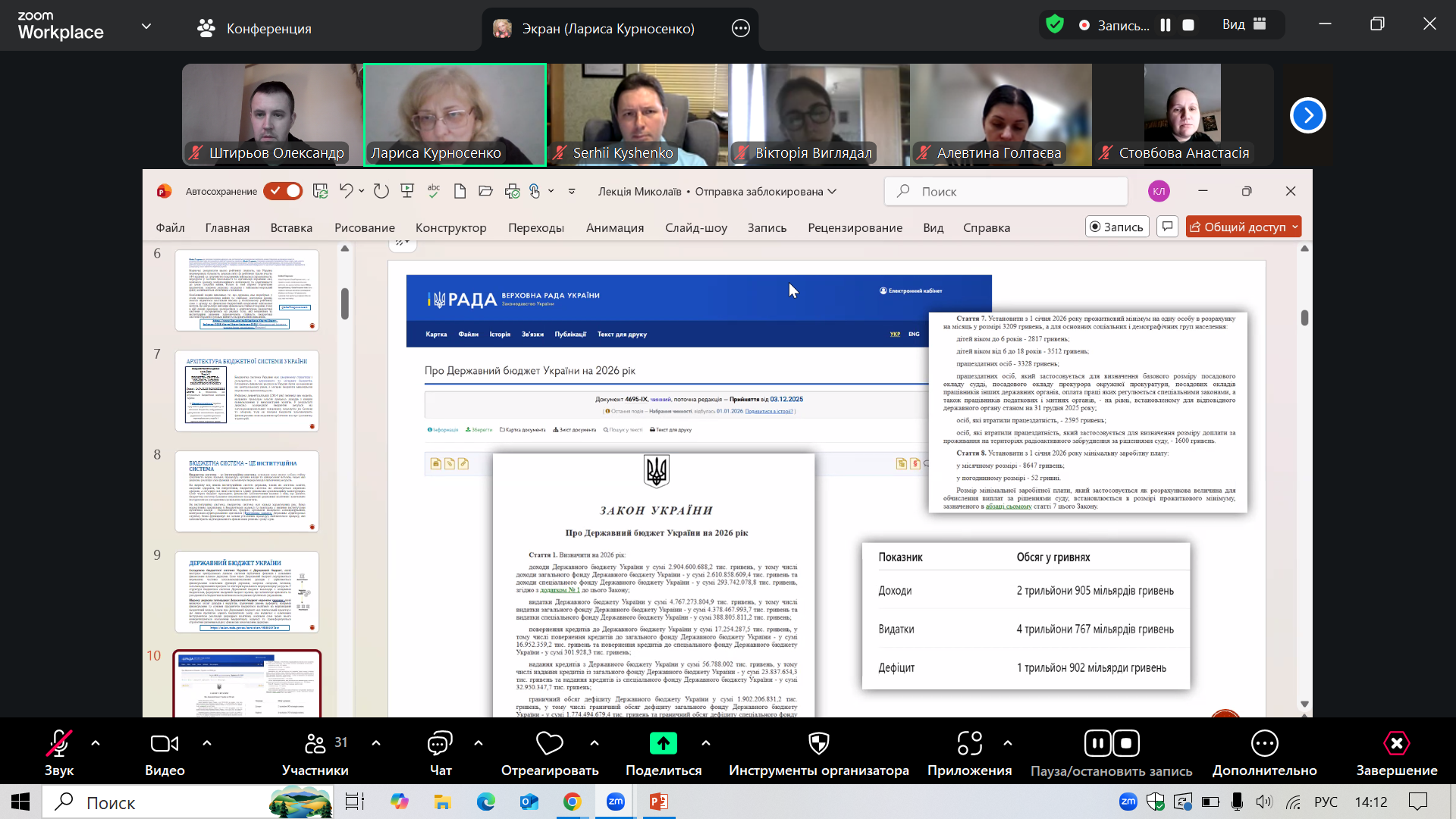 Учасники заходу мали можливість ознайомитися з актуальними матеріалами, представленими у вигляді змістовної та візуально насиченої презентації. Перша частина лекції була присвячена комплексному аналізу архітектури бюджетної системи України. Особливу увагу спікерка зосередила на ключових положеннях Бюджетного кодексу України, а також на структурі та параметрах Державного бюджету на 2026 рік. Огляд супроводжувався аналізом макроекономічних показників і динаміки бюджетного планування, що дозволило слухачам отримати цілісне уявлення про сучасну модель публічних фінансів України в умовах кризи та війни.