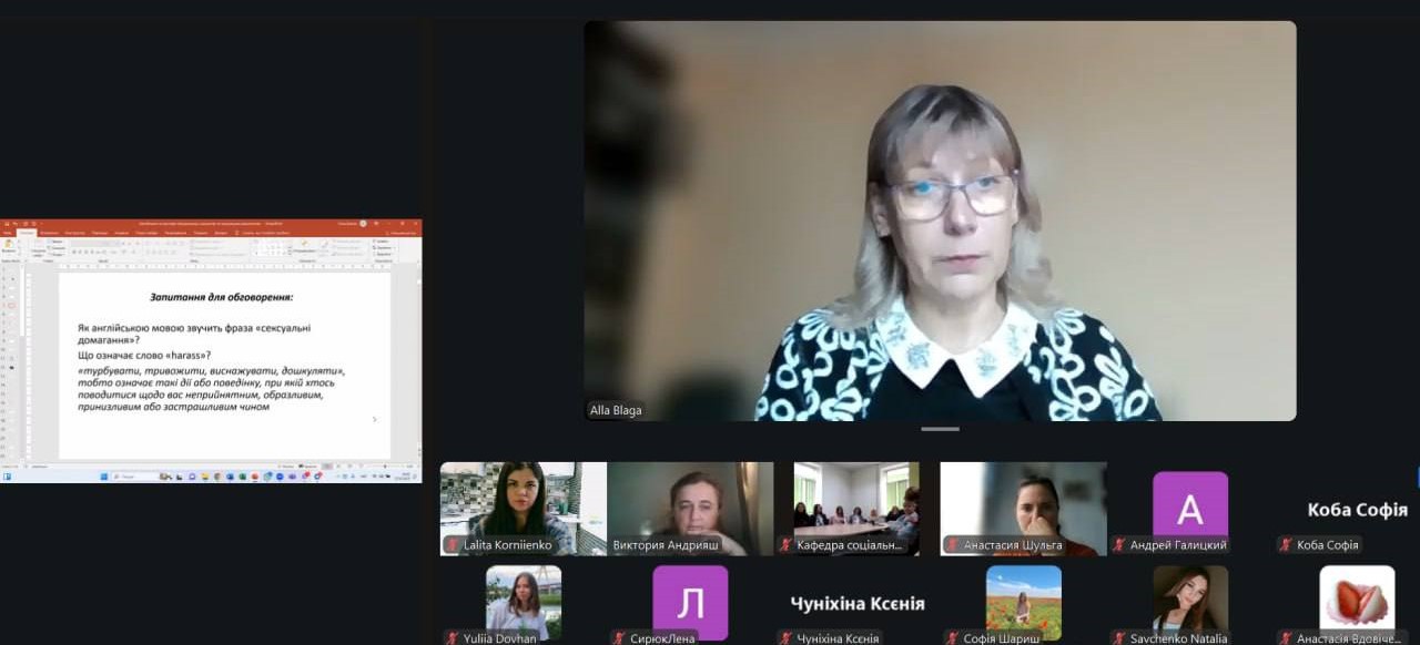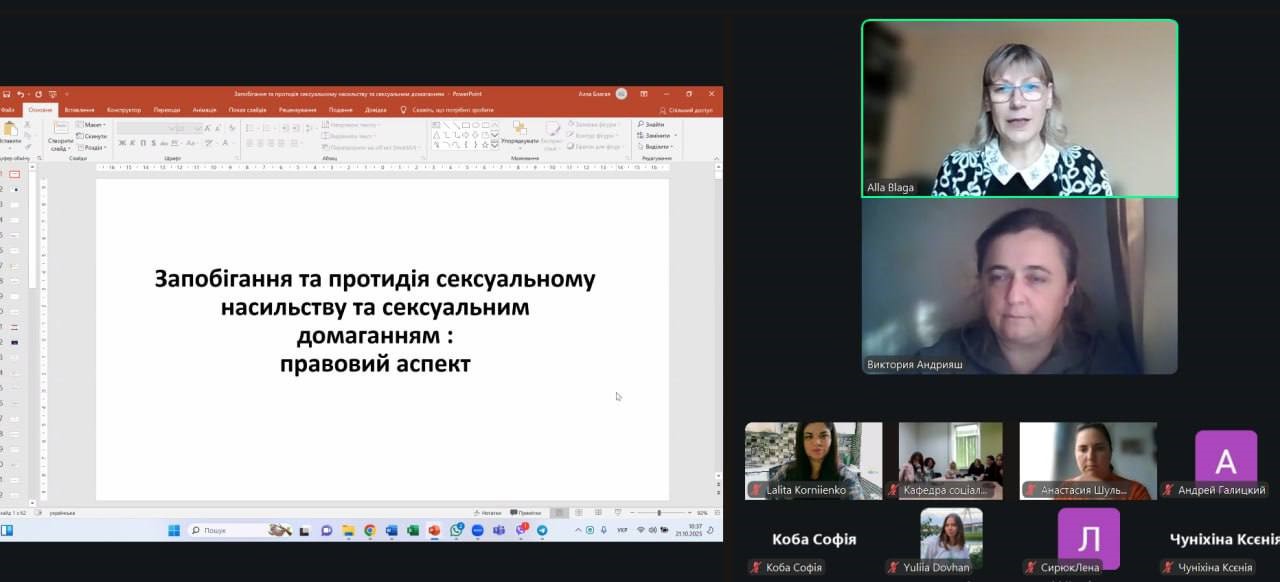 Під час лекції Алла Борисівна розкрила правові, соціальні та етичні аспекти проблеми сексуальних домагань, окреслила механізми правового захисту постраждалих осіб, а також роль фахівців соціальної сфери у запобіганні, виявленні та подоланні подібних випадків. Особливу увагу було приділено зв’язку теми сексуального насильства з соціальною політикою держави, системою захисту прав людини та освітнім середовищем, у якому майбутні фахівці здійснюватимуть свою професійну діяльність.