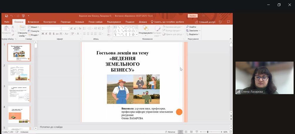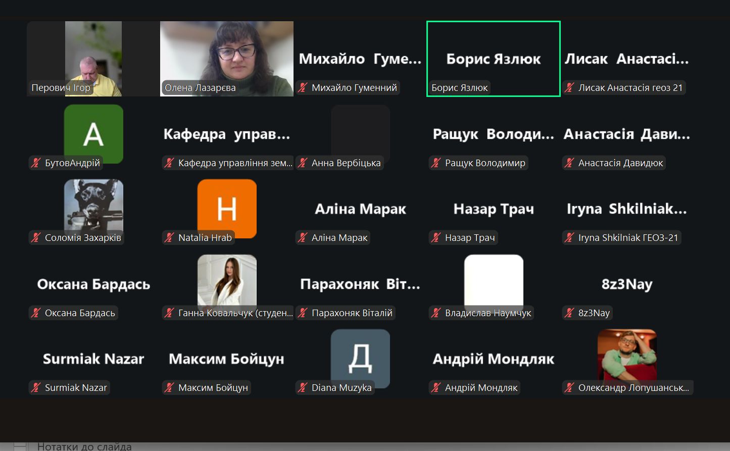 15 жовтня 2025 року професорка кафедри управління земельними ресурсами Олена Лазарєва на запрошення кафедри економічної експертизи та землевпорядкування Західноукраїнського національного університету провела відкриту лекцію для студентів спеціальності G18 «Геодезія та землеустрій», які навчаються за освітньою програмою «Експертна оцінка землі та нерухомого майна».
