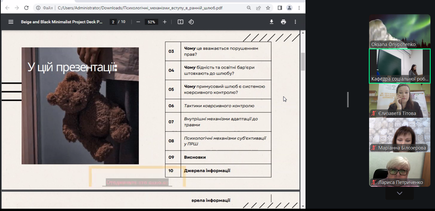 Заняття було організоване доцентами кафедри соціальної роботи, педагогіки і логопедії ЧНУ імені Петра Могили Сурговою С. Ю. та Файчук О. Л., а також доктором педагогічних наук, професором кафедри соціальної роботи ХГПА Онипченко О. І. Участь у заході взяли здобувачі освітнього ступеня «бакалавр» першого та другого курсів спеціальності «Соціальна робота та консультування».