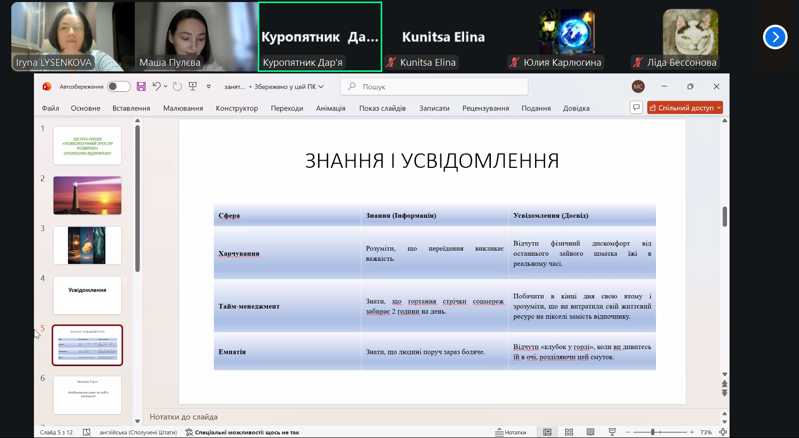 На завершення зустрічі було проведено вправу «Континуум усвідомлення». Фраза «Зараз я усвідомлюю…» допомогла кожному повернутися з думок у реальність, відчути власне тіло та емоційний стан наприкінці насиченого дня.