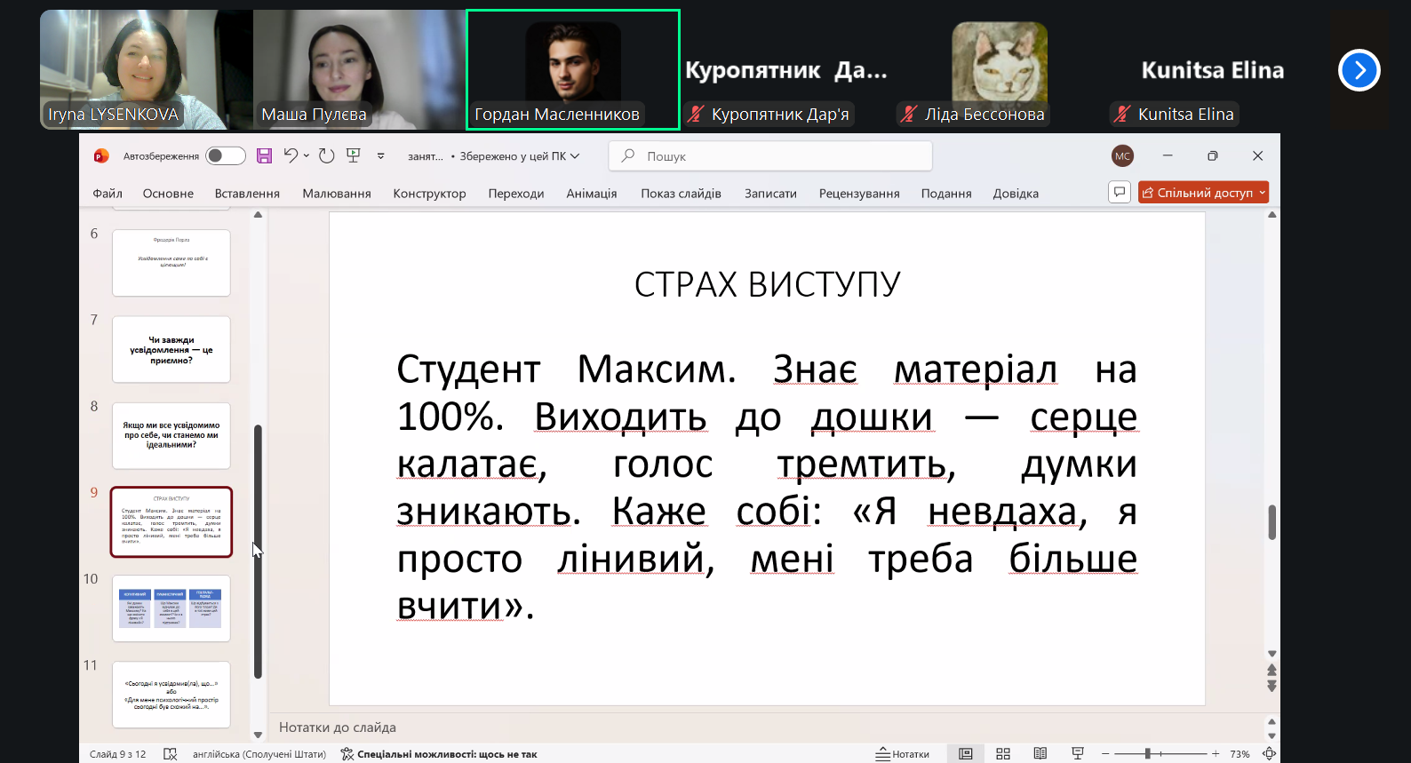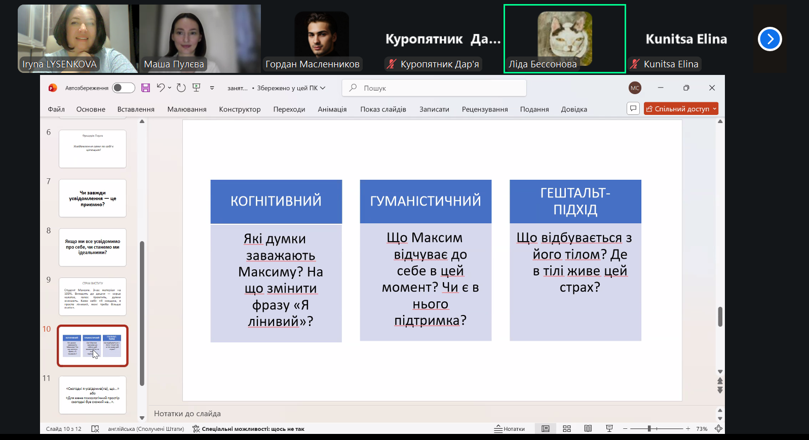 Особливий інтерес викликав кейс-аналіз ситуації «Страху виступу». Учасники розглядали проблему з трьох ракурсів: когнітивного, гуманістичного та гештальт-підходу. Це дозволило побачити, як теоретичні знання допомагають зрозуміти реальні життєві труднощі, такі як самокритика чи тілесний затиск.