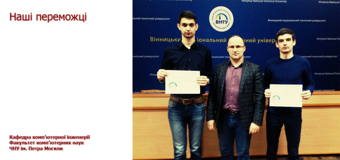22-24 березня на базі Вінницького національного технічного університету проходив Всеукраїнський конкурс студентських наукових робіт із напряму «Інформатика, обчислювальна техніка та автоматизація» Дипломом I ступеня Румянков Дмитро Ігорович Модифікація метода шифрування з використанням операції XOR для створення корпоративного мессенджера віддалених філій Модифікація метода шифрування з використанням операції XOR для створення корпоративного мессенджера віддалених філій. (керівник Журавська Ірина Миколаївна, к.т.н, доц.) Дипломом II ступеня Єндзевич Олександр Володимирович Програмний модуль інформаційної системи з використанням BLE-пристроїв для аналізу клієнтської активності у торговельних комплексах ( керівник Бурлаченко І.С.) http://impuls.vntu.edu.ua/index.php?option=com_content&view=article&id=2861%3A2016-03-31-19-58-58&catid=4%3A2014-02-07-12-35-57&Itemid=2&lang=en
