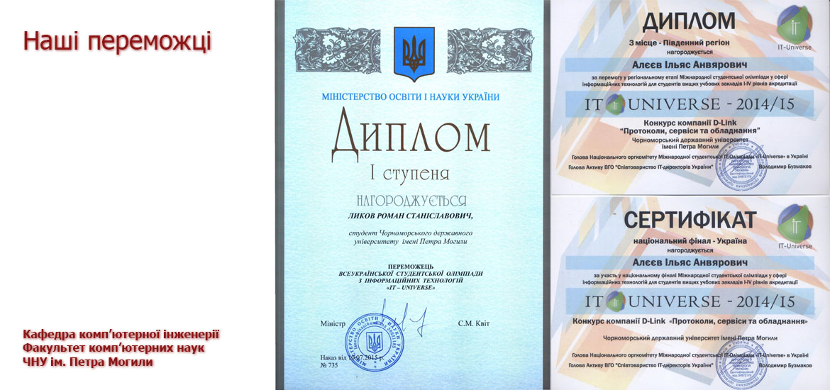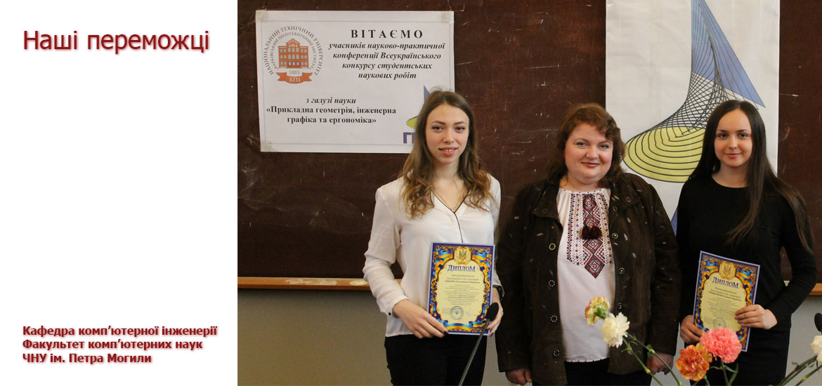 Студентки 4-ого курсу спеціальності «Комп’ютерна інженерія» Кременченко Олена та Завалко Єлизавета на Всеукраїнському конкурсі студентських наукових робіт зі спеціалізації «Прикладна геометрія, інженерна графіка та технічна естетика» отримали диплом ІІ ступеню!!! (Керівник д.т.н., професор Хомченко Анатолій Никифорович).