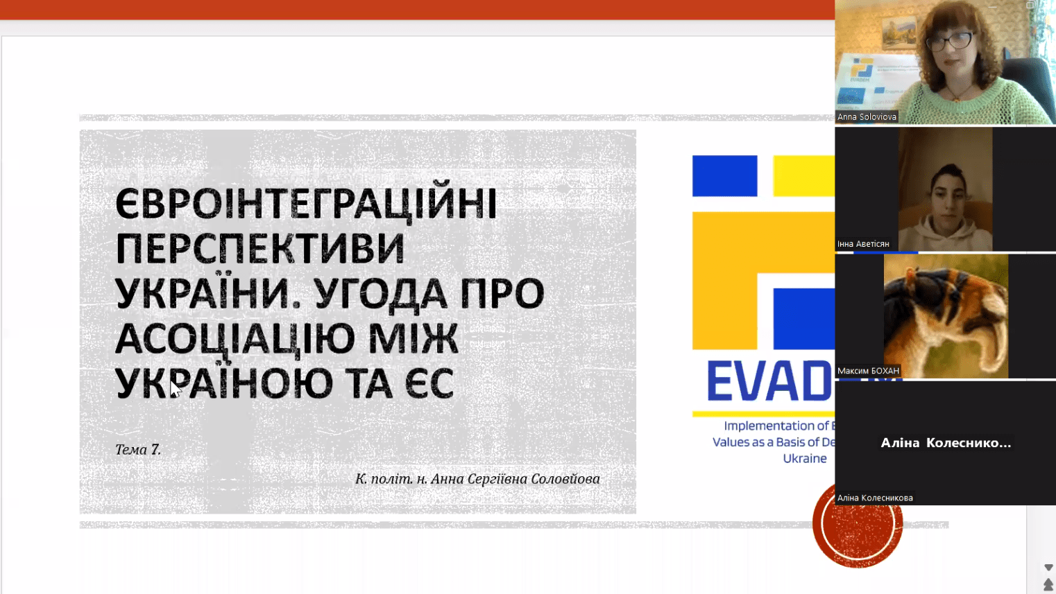 28 квітня 2023 року кандидат політичних наук, доцент кафедри журналістики Чорноморського національного університету імені Петра Могили Анна Соловйова провела сьому відкриту лекцію циклу «Сучасний етап та перспективи функціонування ЄС. Україна та процеси європейської інтеграції». Темою зустрічі була «Євроінтеграційні перспективи України. Угода про Асоціацію між Україною та ЄС».