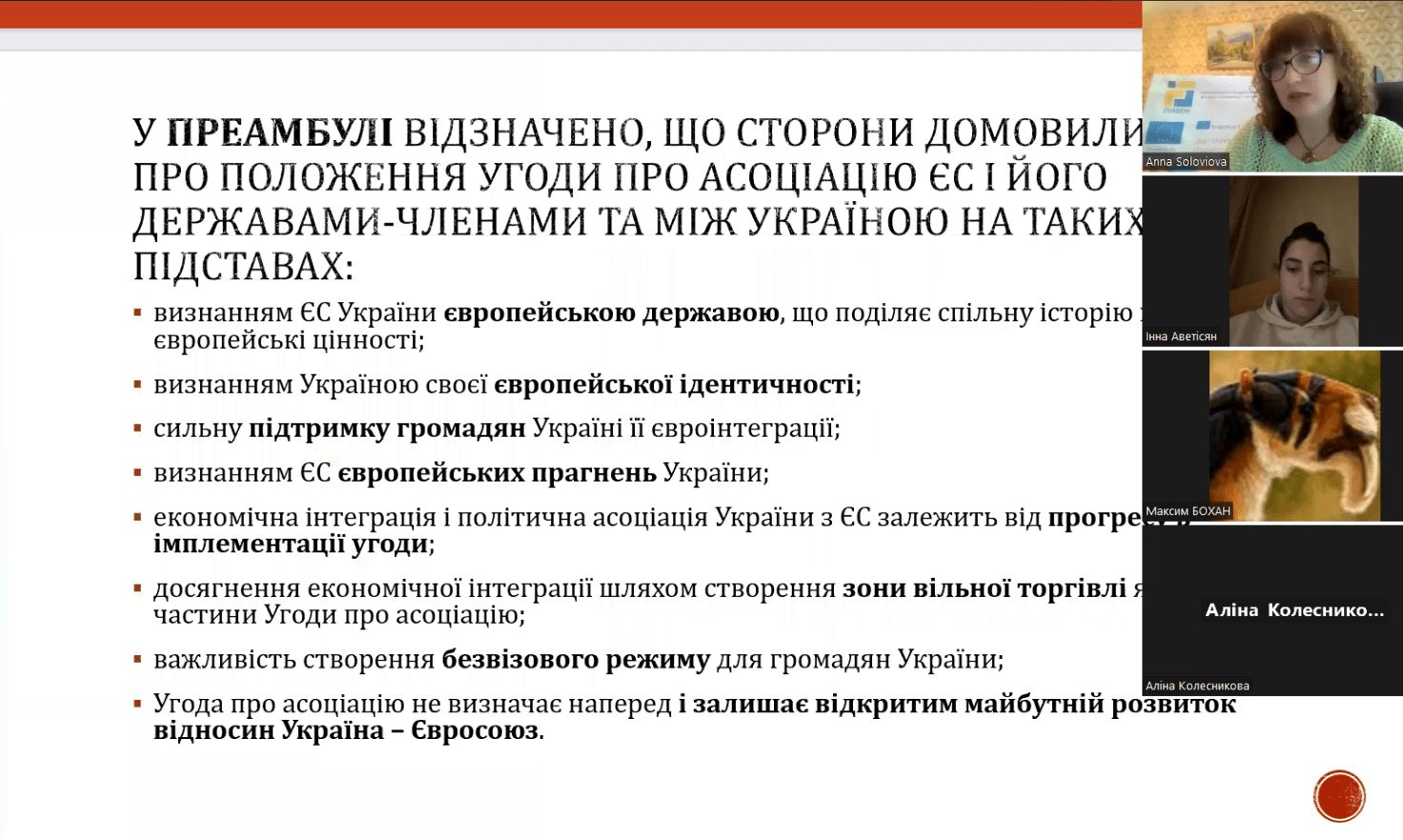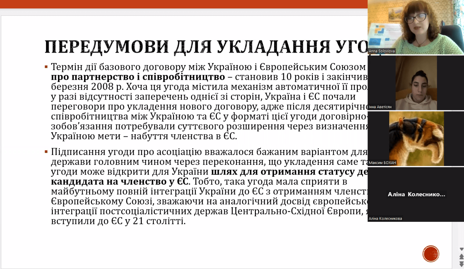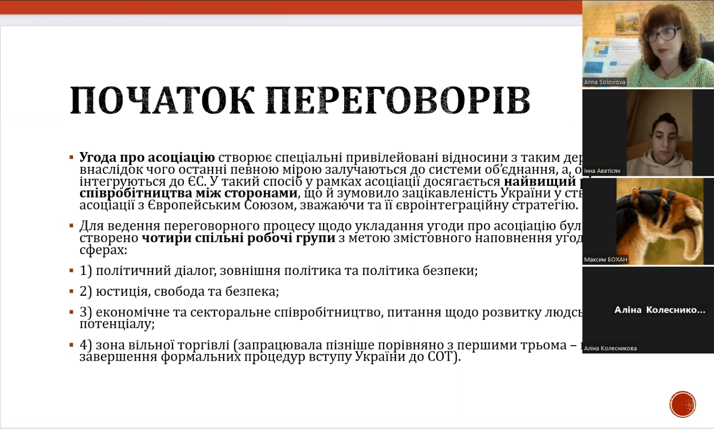 Лекторка окреслила передумови для укладання угоди про асоціацію між Україною та ЄС. З 1998 по 2008 рік діяв договір про партнерство та співпрацю, і ось з 2008 по 2014 рік йшли переговори про асоціацію, яка була необхідна для подальшого членства України в ЄС.