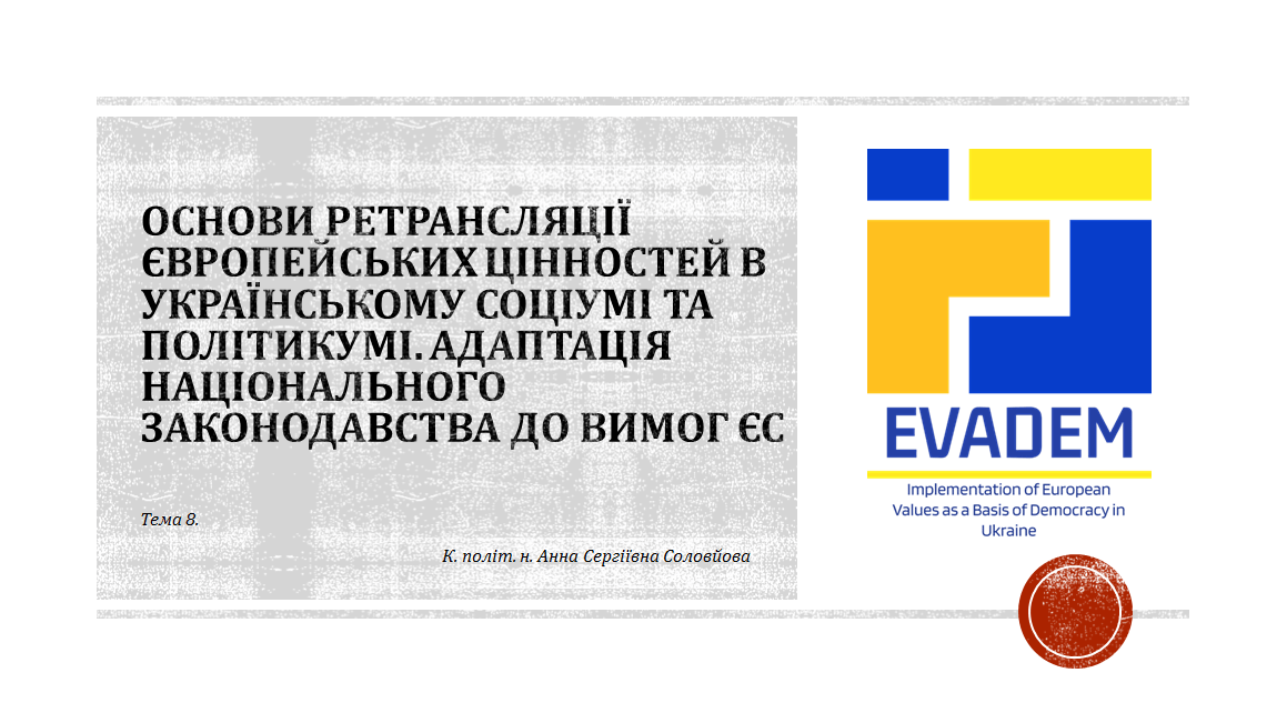 5 травня 2023 року кандидат політичних наук, доцент кафедри журналістики Чорноморського національного університету імені Петра Могили Анна Соловйова провела восьму відкриту лекцію циклу «Сучасний етап та перспективи функціонування ЄС. Україна та процеси європейської інтеграції». Темою зустрічі була «Основи ретрансляції європейських цінностей в українському соціумі та політикумі. Адаптація національного законодавства до вимог ЄС».