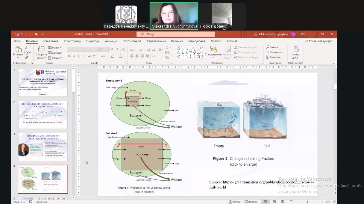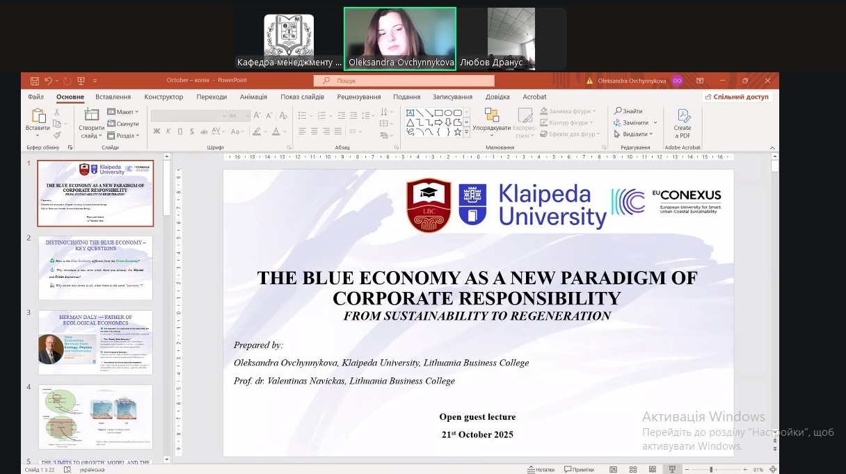 21 жовтня 2025 року докторантка Клайпедського університету (кафедра менеджменту та економіки) Олександра Овчинникова, яка працює під керівництвом професора, доктора габілітованого В. Навіцікаса, а також є лекторкою Литовського коледжу бізнесу (м. Клайпеда, Литва), прочитала гостьову лекцію на тему: «Блакитна економіка як нова парадигма корпоративної відповідальності: від сталого розвитку до відновлення».