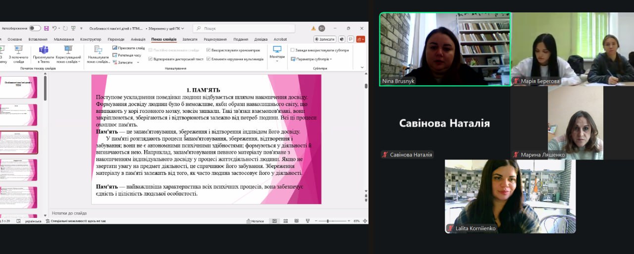 Лекції на теми «Пропедевтика порушень мовленнєвої діяльності» та «Особливості памʼяті дітей із тяжкими порушеннями мовлення» провели логопед, дефектолог Криворізької гімназії №45 Криворізької міської ради Марина Ляшенко, та практичний психолог комунального закладу «Ліцей №24» Камʼянської міської ради Ніна Брусник.