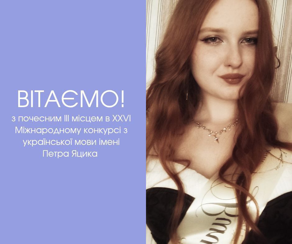 Щиро вітаємо студентку першого курсу спеціальності В11.01 Філологія (ОП «Українська філологія, англійська мова та переклад включно») факультету філології Яніну Урсул із почесним ІІІ місцем у ХХVI Міжнародному конкурсі з української мови імені Петра Яцика!