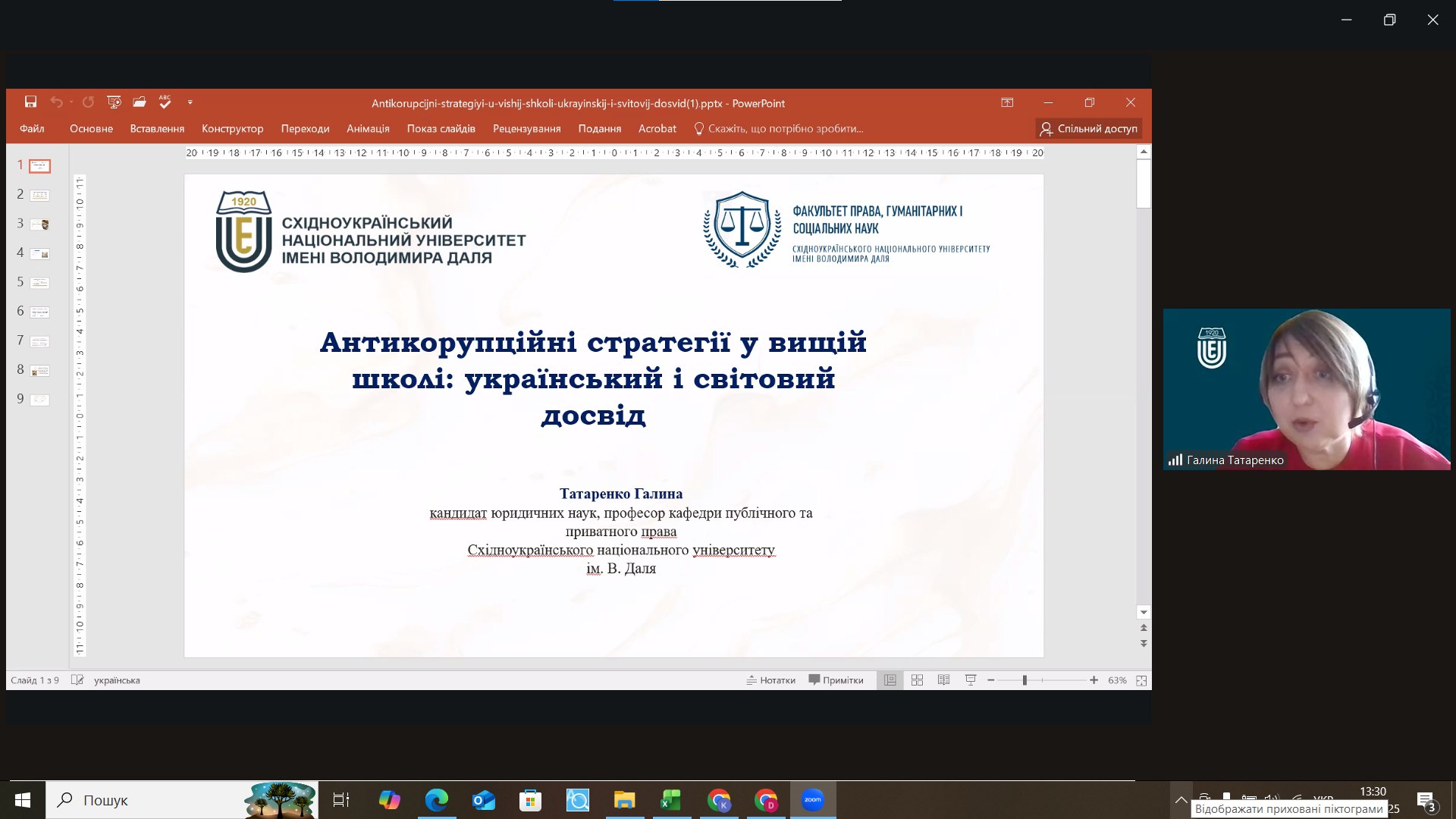 The plenary reports were delivered by PhD in Law, Professor of the Department of Public and Private Law of V. Dahl East Ukrainian National University G.V. Tatarenko, and PhD in Law, Head of the NGO “Protection against Corruption”, lawyer V.V. Kurian. The event was moderated by PhD in Law, Associate Professor O.V. Tkalia, member of the project team.
