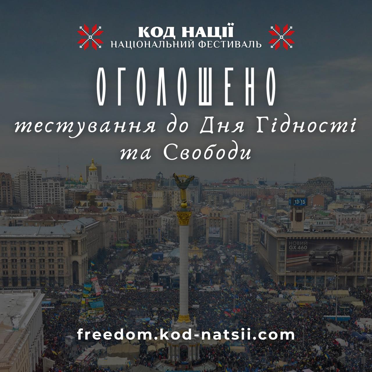 Національний фестиваль «Код нації» повідомляє про проведення тестування, приуроченого до Дня Гідності та Свободи. Захід покликаний поглибити розуміння учасниками історичної значущості Революції Гідності, стимулювати інтерес до вивчення української історії та сприяти формуванню свідомої громадянської позиції в сучасному українському суспільстві.
