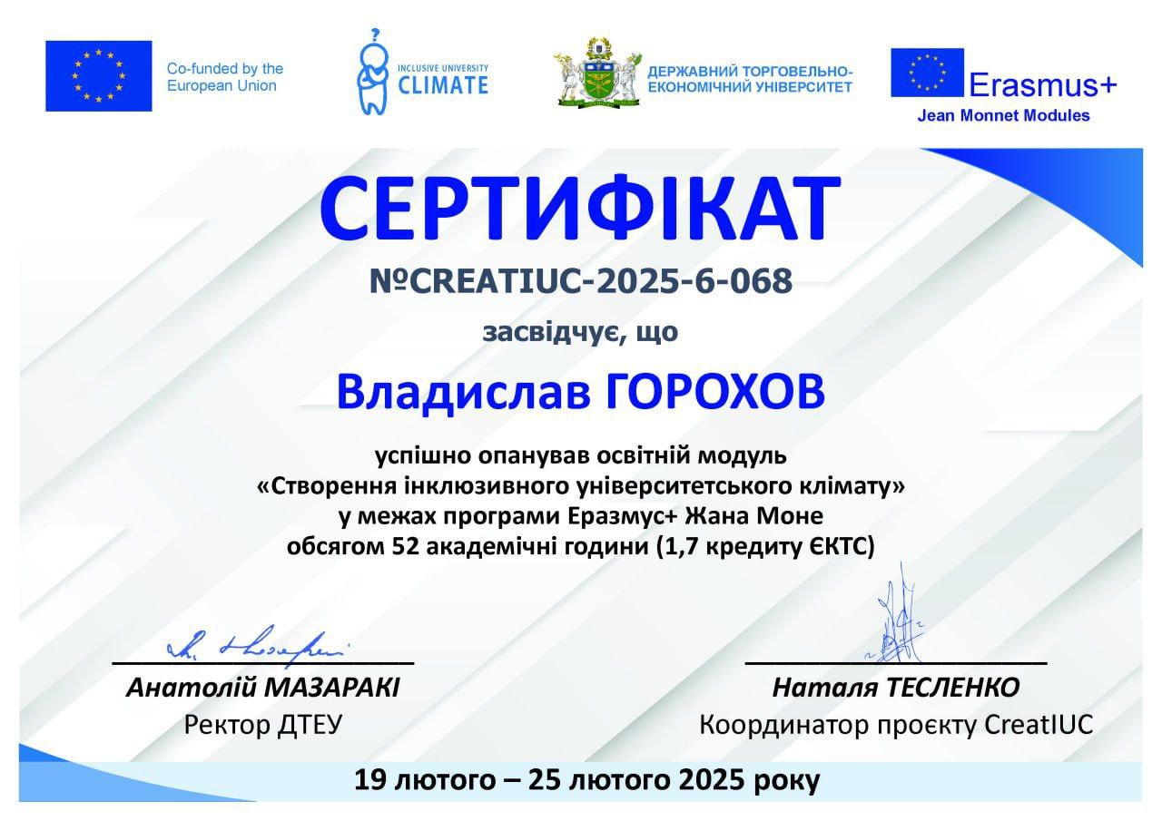 | 23. | Горохов Владислав Вадимович | 2024 | «Створення інклюзивного університетського клімату» у межах програми Еразмус+ Жана Моне. Сертифікат № CREATIUC-2025-6-068 (52 годин – 1,7 кредити ЄКТС; Термін навчання: 19–25 лютого 2025 р.) | Науково-педагогічна практика | д.е.н., проф. Ужва А. М. | Сертифікат |
