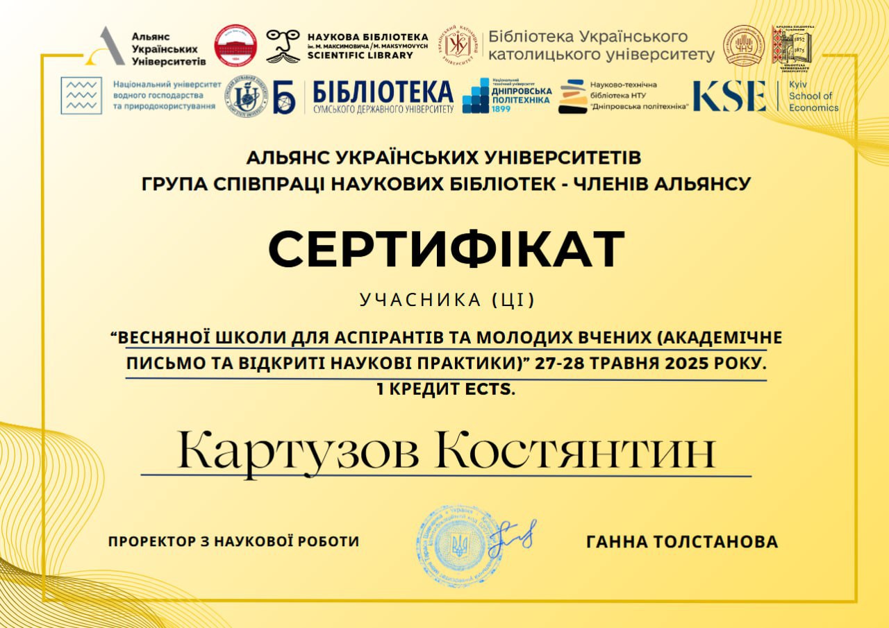 | 5. | Картузов Костянтин Миколайович | 2023 | «Весняна школа для аспірантів та молодих вчених (академічне письмо та відкриті наукові практики)». Термін навчання: 27–28 травня 2025 р. | Підготовка до захисту дисертаційного дослідження | Сертифікат | |