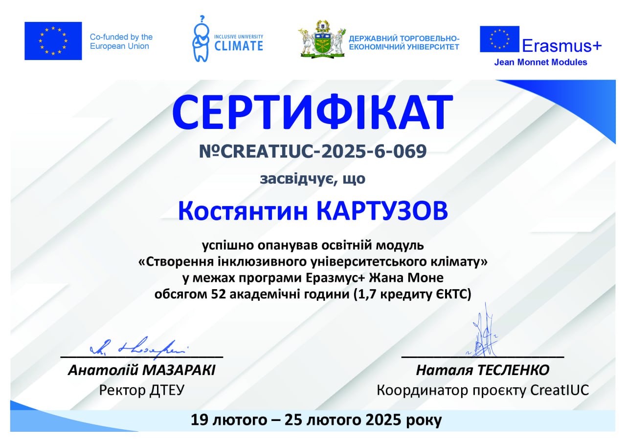 | 6. | Картузов Костянтин Миколайович | 2023 | «Створення інклюзивного університетського клімату» у межах програми Еразмус+ Жана Моне. Сертифікат № CREATIUC-2025-6-069. (52 години – 1,7 кредити ЄКТС; Термін навчання: 19–25 лютого 2025 р.) |