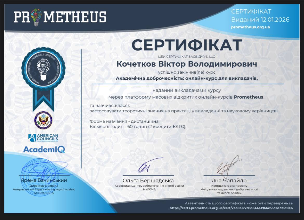 | 27. | Ткаченко Віталій Віталійович | 2025 | «Академічна доброчесність: онлайн-курс для викладачів». Сертифікат від 30.10.2025 (60 годин – 2 кредити ЄКТС; Термін навчання: 30.10.2025) | Підготовка до дисертаційного дослідження | Сертифікат | |