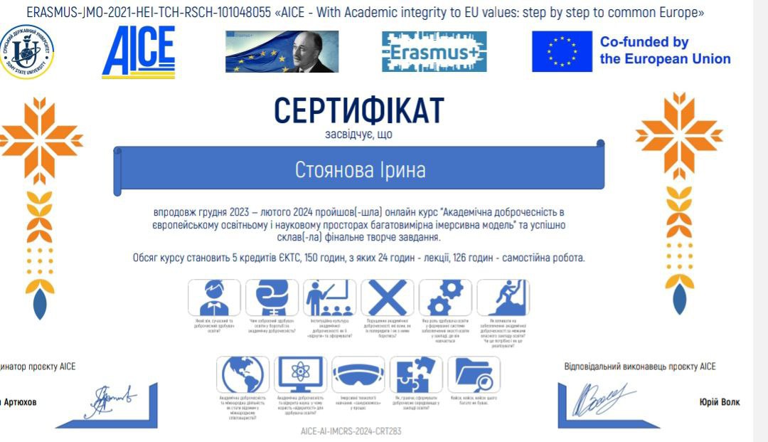2023 | «Академічна доброчесність в європейському освітньому і науковому просторах багатовимірна імерсивна модель». Сертифікат № AICE-AL-IMCRS-2024-CRT328 (150 годин – 5 кредитів ЄКТС; Термін навчання: Грудень 2023 р. – лютий 2024 р.) |