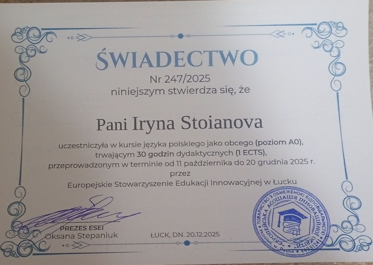 2023 | Свідоцтво про участь у курсі польської мови як іноземної. Сертифікат № Nr 247/2025 від 20.12.2025 (30 годин – 1 кредит ЄКТС; Термін навчання: 11 жовтня – 20 грудня 2025 р. ) | Підготовка до захисту дисертаційного дослідження | Сертифікат | |