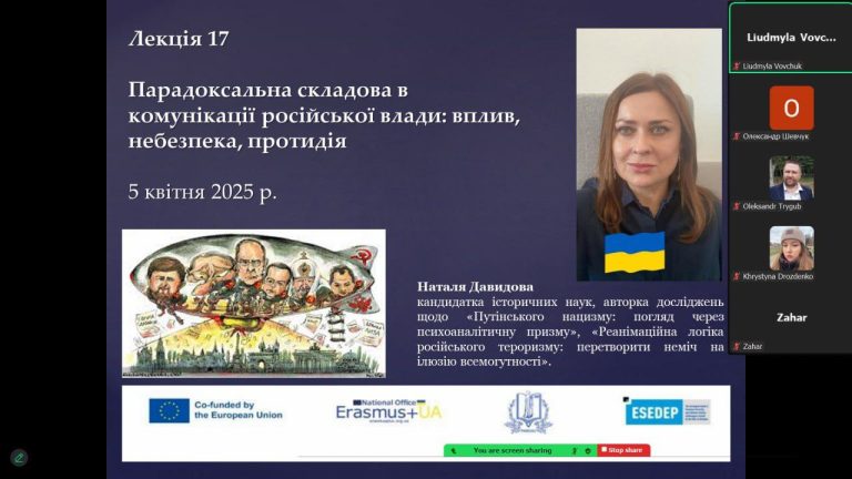 05 квітня 2025 року в рамках навчального курсу «Спільна політика безпеки та оборони Європейського Союзу: виклики, пов’язані з війною в Україні» відбулася відкрита лекція Наталі Давидової, кандидатки історичних наук, авторки досліджень щодо «Путінського нацизму: погляд через психоаналітичну призму», «Реанімаційна логіка … Читати далі Парадоксальна складова в комунікації російської влади: вплив, небезпека, протидія – відкрита лекція експертки Наталі Давидової