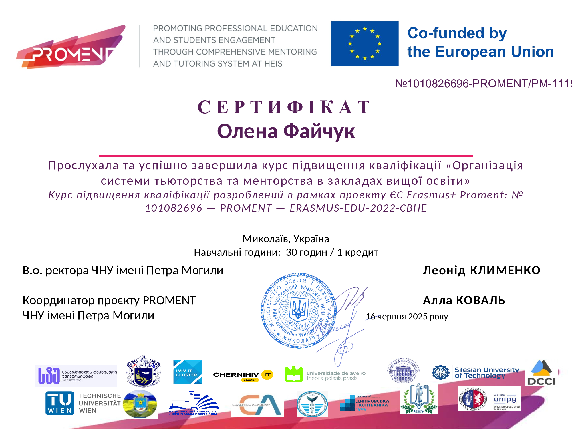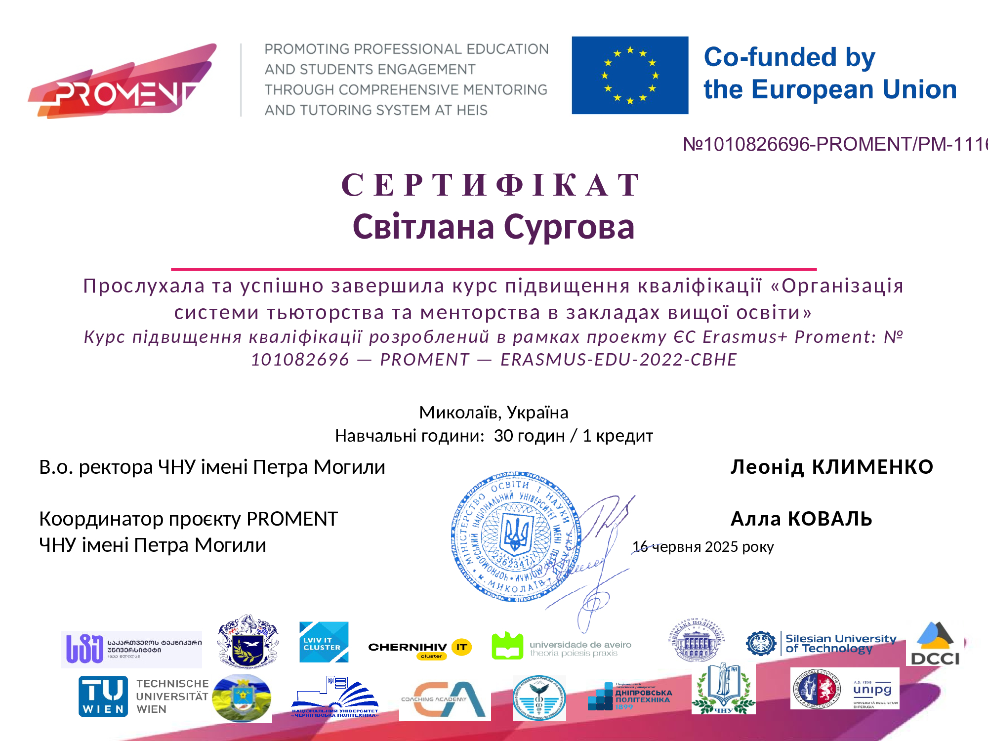 Курс було розроблено в межах проєкту Європейського Союзу Erasmus+ PROMENT (№ 101082696 – PROMENT – ERASMUS-EDU-2022-CBHE) і він передбачав 30 навчальних годин (1 кредит ЄКТС). За результатами навчання всі учасники отримали сертифікати, що підтверджують набуття відповідних компетентностей та готовність упроваджувати сучасні підходи тьюторства й менторства у роботі зі студентами.