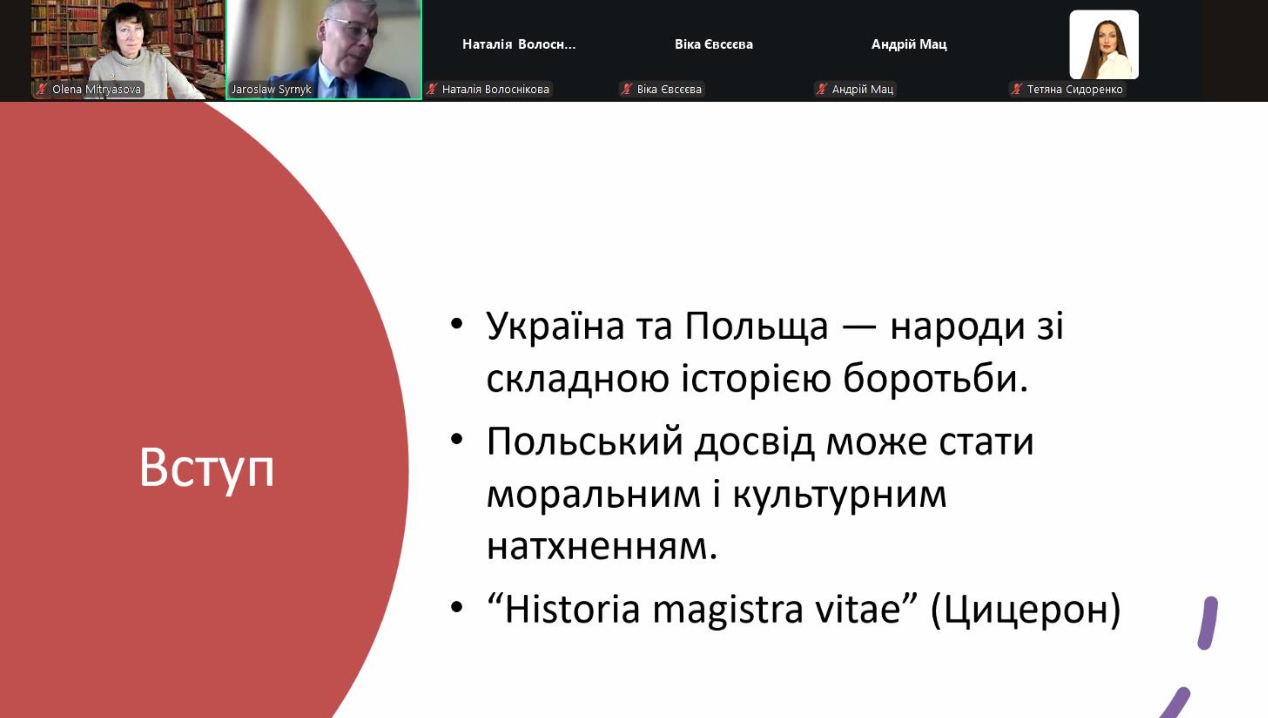 Спікером виступив Ярослав Сирник, доктор габілітований, професор Вроцлавського університету (Польща). Професор поділився глибоким історичним аналізом багатовікової боротьби польського народу за державність, зокрема періодами поділів, окупації та відродження.