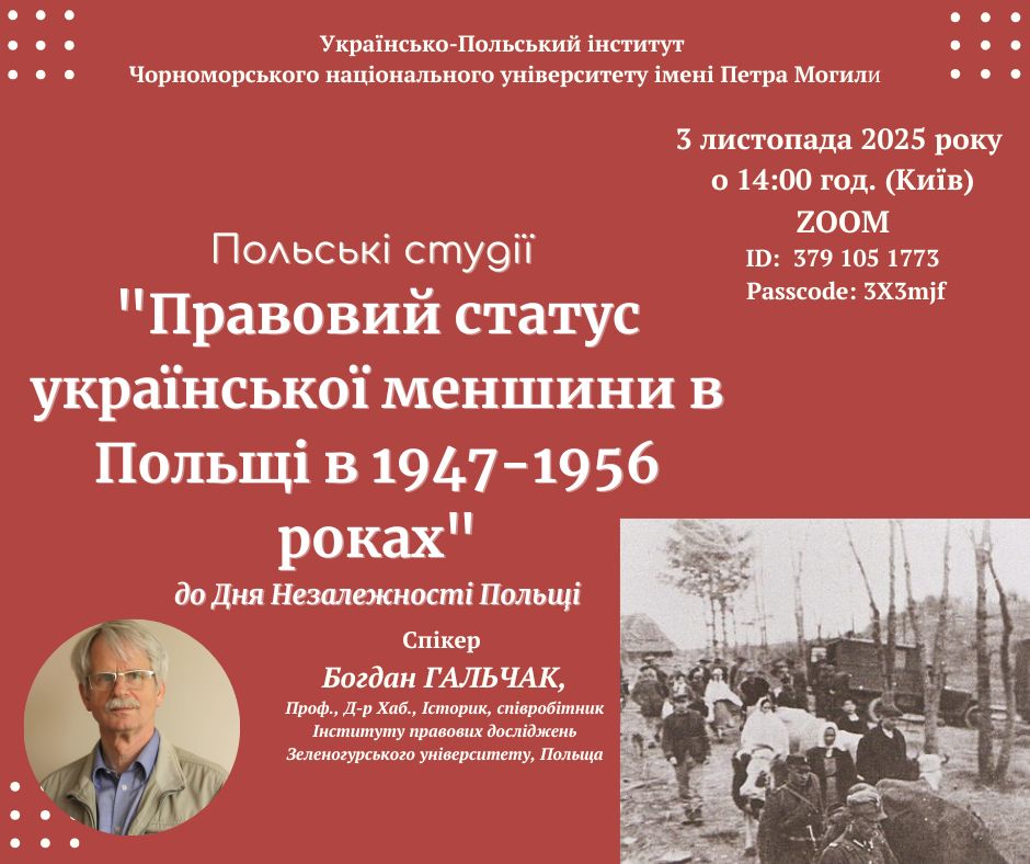 Українсько-Польський інститут Чорноморського національного університету імені Петра Могили запрошує на відкриту лекцію-презентацію, присвячену Дню незалежності Польщі. Тема: «Правовий статус української меншини в Польщі в 1947–1956 роках». Дата та час: 3 листопада 2025 року о 14:00 год. (Київ) Формат: Онлайн, ZOOM …
