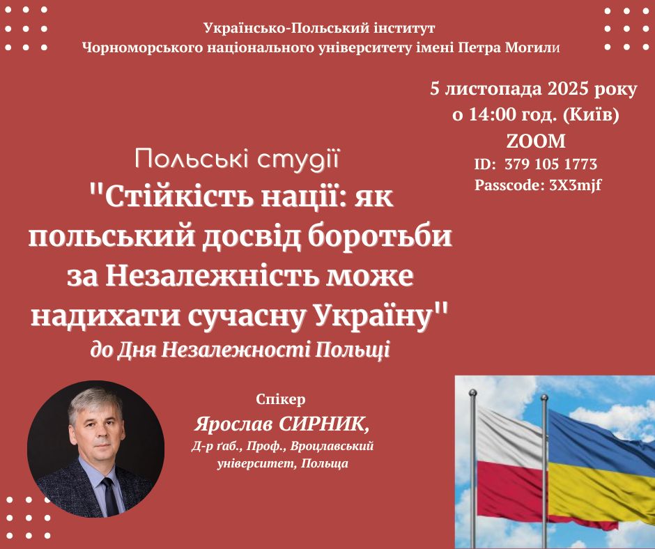 Українсько-Польський інститут Чорноморського національного університету імені Петра Могили запрошує на відкриту лекцію. Тема: «Стійкість нації: як польський досвід боротьби за незалежність може надихати сучасну Україну» Подія присвячена Дню незалежності Польщі. Дата та час: 5 листопада 2025 року о 14:00 год. …