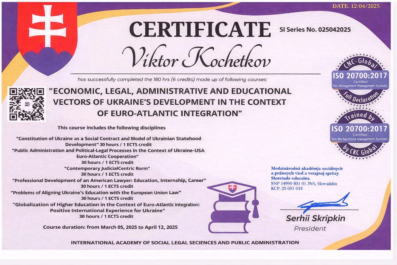 | 1. | Кочетков Віктор Володимирович | «Economic, legal, administrative and educational vectors of Ukraines development in the context of Euro-Atlantic integration» (Економіко-правові, управлінські та освітні вектори розбудови України в контексті євроатлантичної інтеграції) | 025042025 | 5 березня – 12 квітня 2025 р. | 12.04.2025 | 6 ECTS (180 год) | Сертифікат |