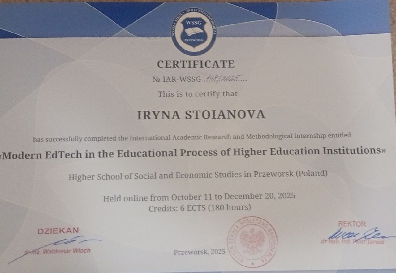 | 10. | Стоянова Ірина Володимирівна | «Modern EdTech in the Educational Process of Higher Education Institutions» (Сучасні освітні технології в освітньому процесі вищих навчальних закладів) | IAR-WSSG 148/2025 | 11 жовтень – 20 грудень 2025 р. | – | 6 ECTS (180 год) | Сертифікат |
