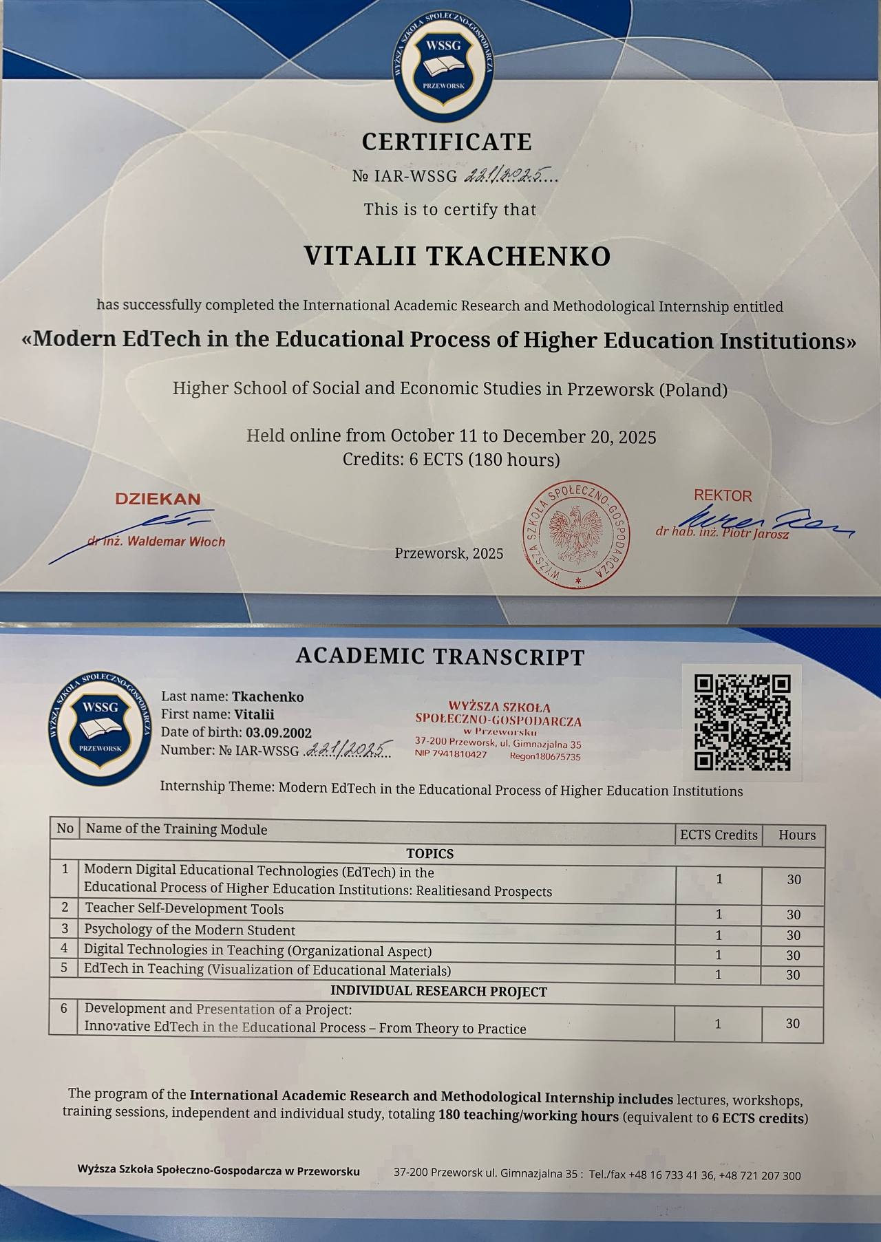 | 16. | Ткаченко Віталій Віталійович | «Modern EdTech in the Educational Process of Higher Education Institutions» (Сучасні освітні технології) | IAR-WSSG 221/2025 | 11 жовтень – 20 грудень 2025 р. | – | 6 ECTS (180 год) | Сертифікат |