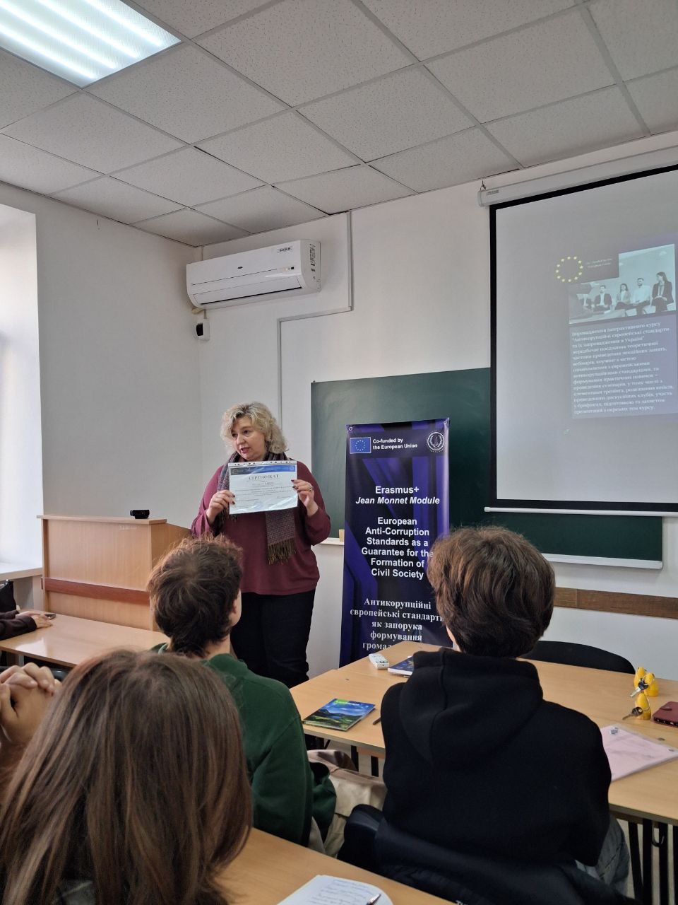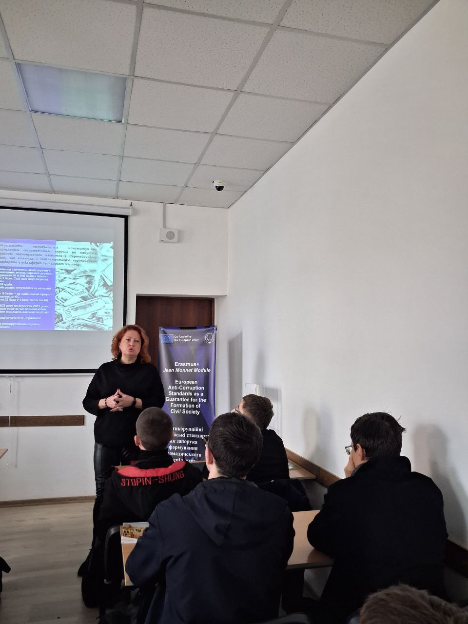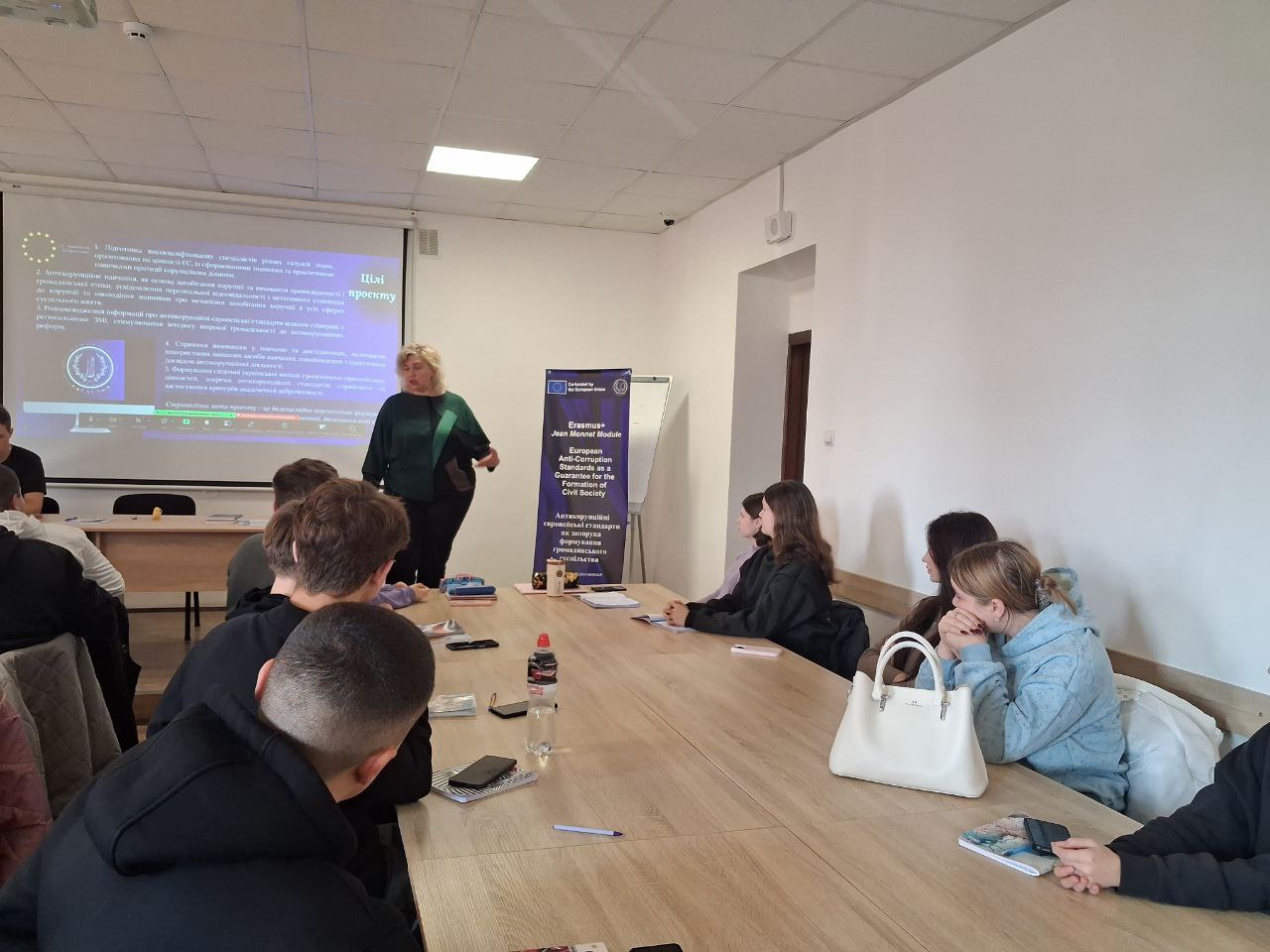 26 листопада команда проєкту представила курс студентам 1 курсу юридичного факультету (гр. 151–152) та факультету політичних наук, спеціальність «Середня освіта (історія та громадянська освіта)» (гр. 133). Участь взяли члени команди проєкту: к.ю.н., доцент Валецька О.В. та к.ю.н., доцент Ткаля О.В.. Зустріч проходила у змішаному форматі (26 студентів офлайн, 6 онлайн). Команда ознайомила учасників з актуальністю впровадження європейських антикорупційних стандартів в освітній простір задля формування майбутнього держави, вільної від корупційних ризиків.