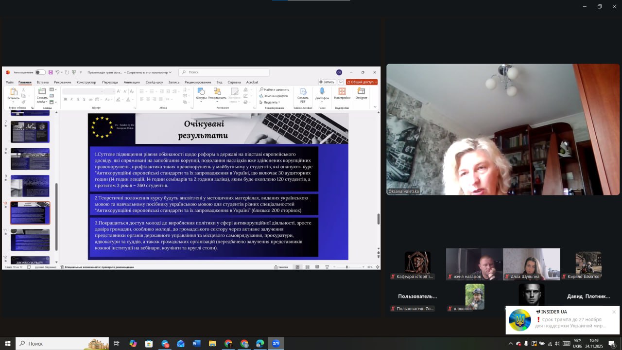 On 24 November, the course “European Anti-Corruption Standards and Their Implementation in Ukraine” was presented online via Zoom for first-year students of the Educational and Scientific Institute of Postgraduate Education, specialising in Law (group 151z). Nine students interested in the proposed elective attended. The blended format and the opportunity to join Zoom sessions help students fully master the course.