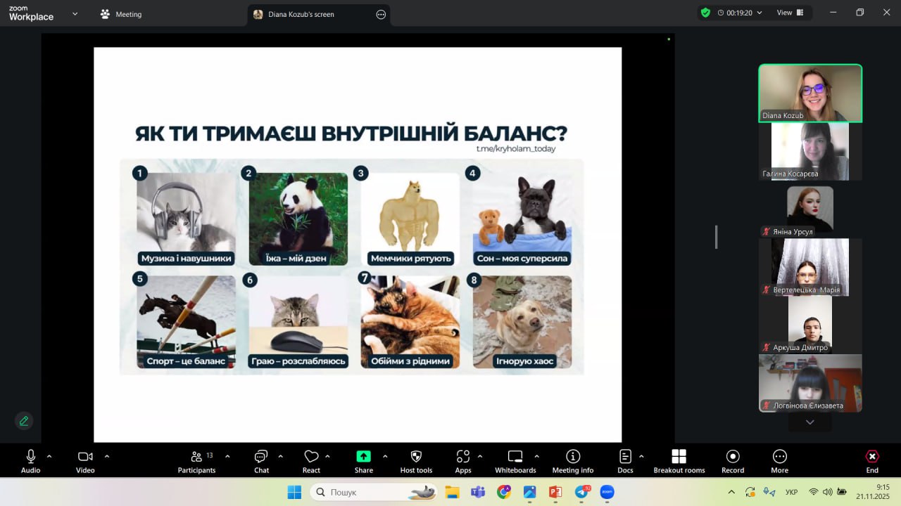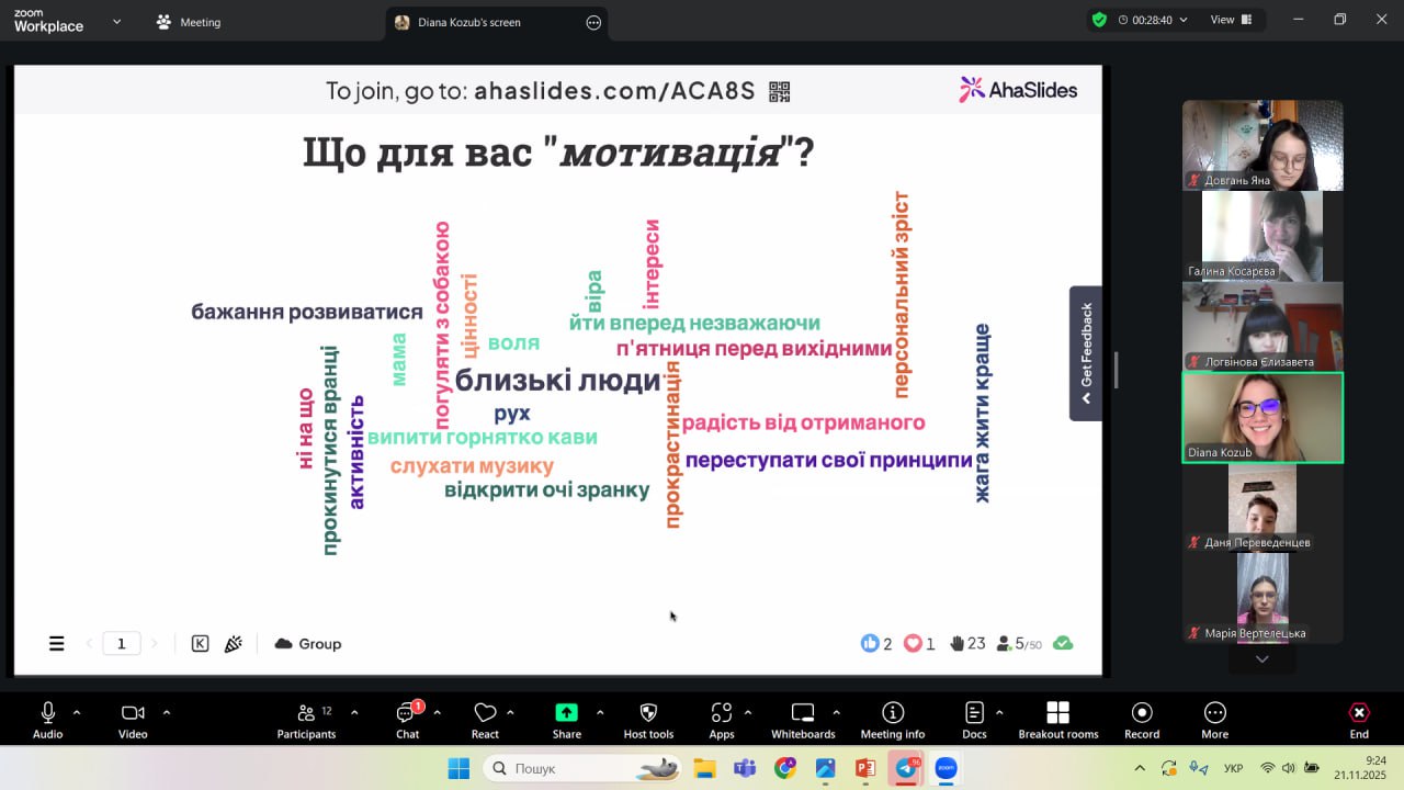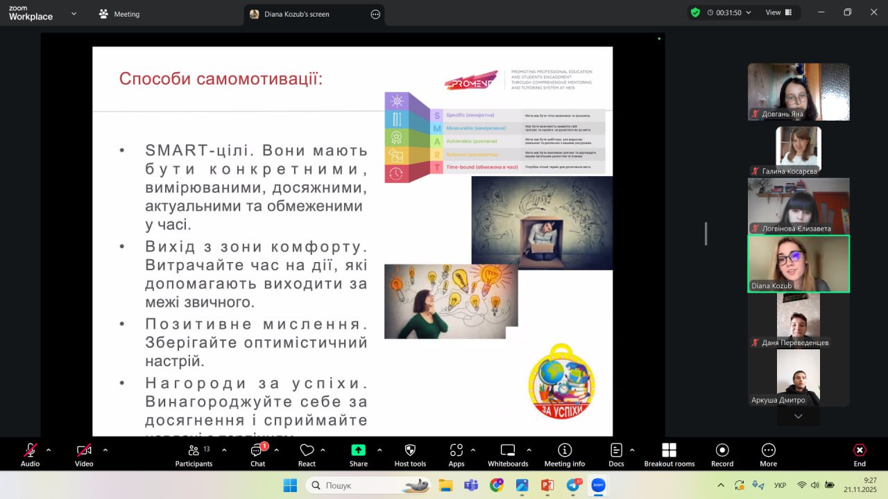 Воркшоп відбувся у змішаному форматі. Студенти дізналися про сутність мотивації та мотиваторів, обговорили джерела самомотивації та важливість внутрішнього стимулу для досягнення успіху. Особливу увагу було приділено темі прокрастинації та практичним методам боротьби з нею.