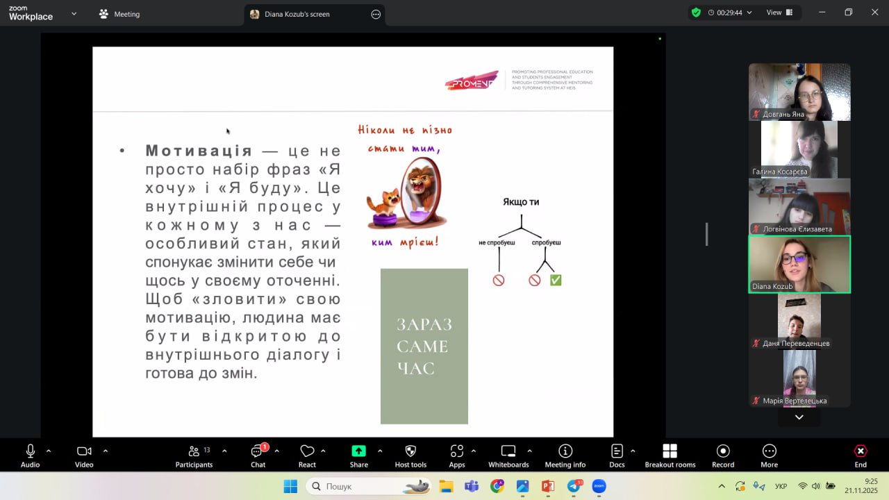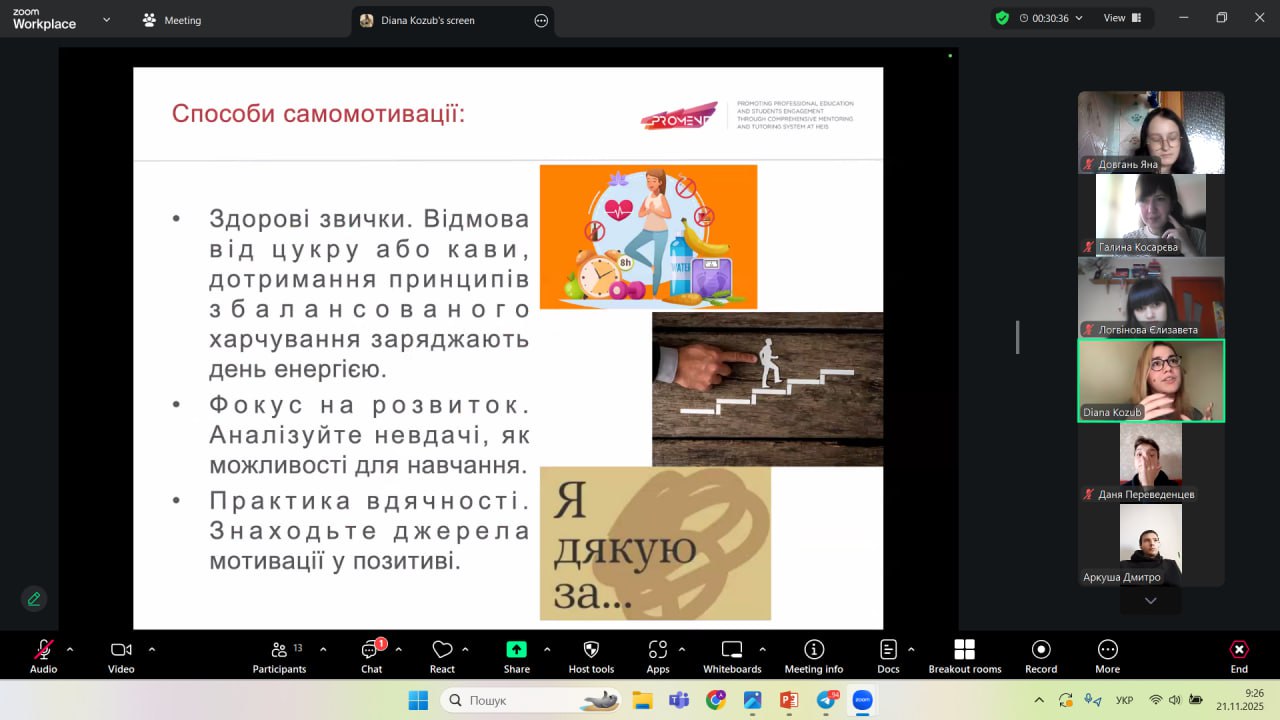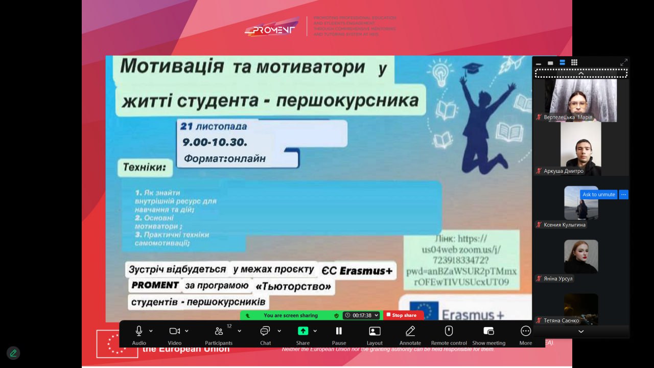 21 листопада 2025 року в межах реалізації проєкту PROMENT «Сприяння професійній освіті та активній участі студентів через становлення комплексної системи менторства та тьюторства у ЗВО» відбувся воркшоп для студентів-тьюті 146 групи факультету філології ЧНУ імені Петра Могили під назвою «Мотивація та мотиватори у житті студента-першокурсника».