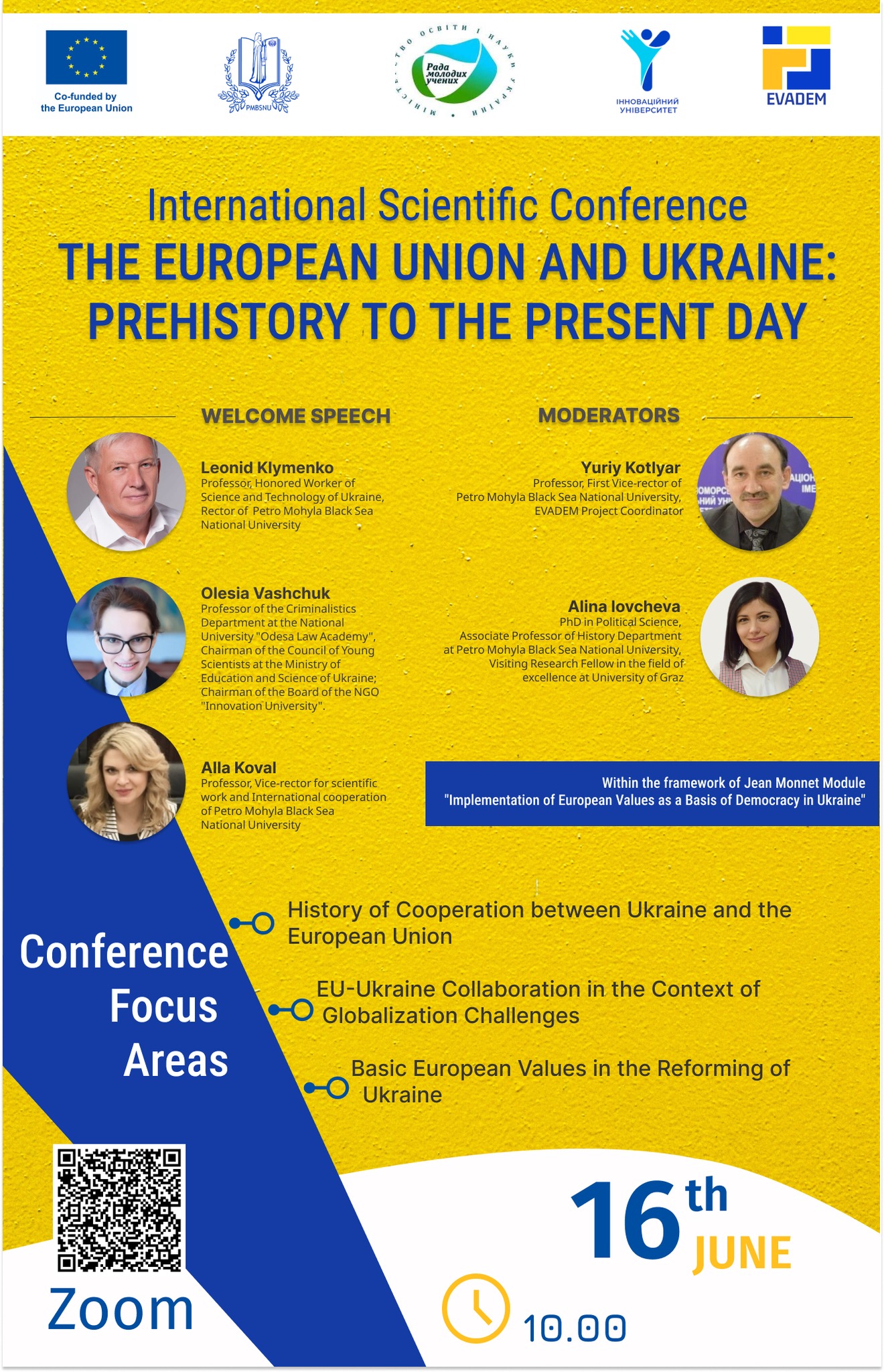 Конференція пройде на базі Чорноморського національного університету імені Петра Могили у рамках міжнародного проєкту Модулю Жана Моне «Імплементація європейських цінностей як базис демократії в Україні» (EVADEM) за підтримки Ради молодих учених при Міністерстві освіти та науки України та всеукраїнської громадської організації «Інноваційний університет».