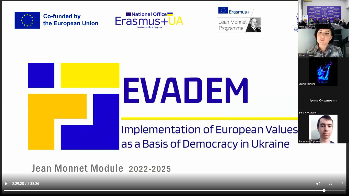 Круглий стіл проведений у рамках міжнародного проєкту Erasmus+ за напрямком Модуль Жана Моне «Імплементація європейських цінностей як базис демократії в Україні» (EVADEM) No101085843 — EVADEM — ERASMUS-JMO-2022-HEI-TCH-RSCH.