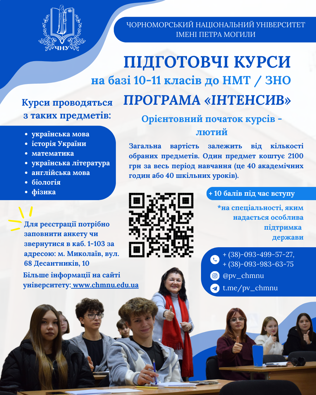 Якісна підготовка до вступу триває! Для учнів 11-х класів, які ще не встигли визначитися з предметами або лише починають системну підготовку, Чорноморський національний університет імені Петра Могили відкриває набір на підготовчі курси за програмою «Інтенсив».