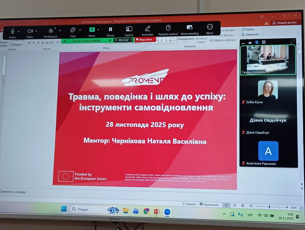28 листопада 2025 року в змішаному форматі відбулася зустріч-тренінг «Травма, поведінка і шлях до успіху: інструменти самовідновлення», який провела вчитель української мови Миколаївського ліцею 2, Чернікова Наталя Василівна, старший учитель, у межах проєкту ЄС Еразмус+101082696-PROMENT «Сприяння професійній освіті та активній участі студентів через становлення комплексної системи менторства та тьюторства у закладах вищої освіти» .