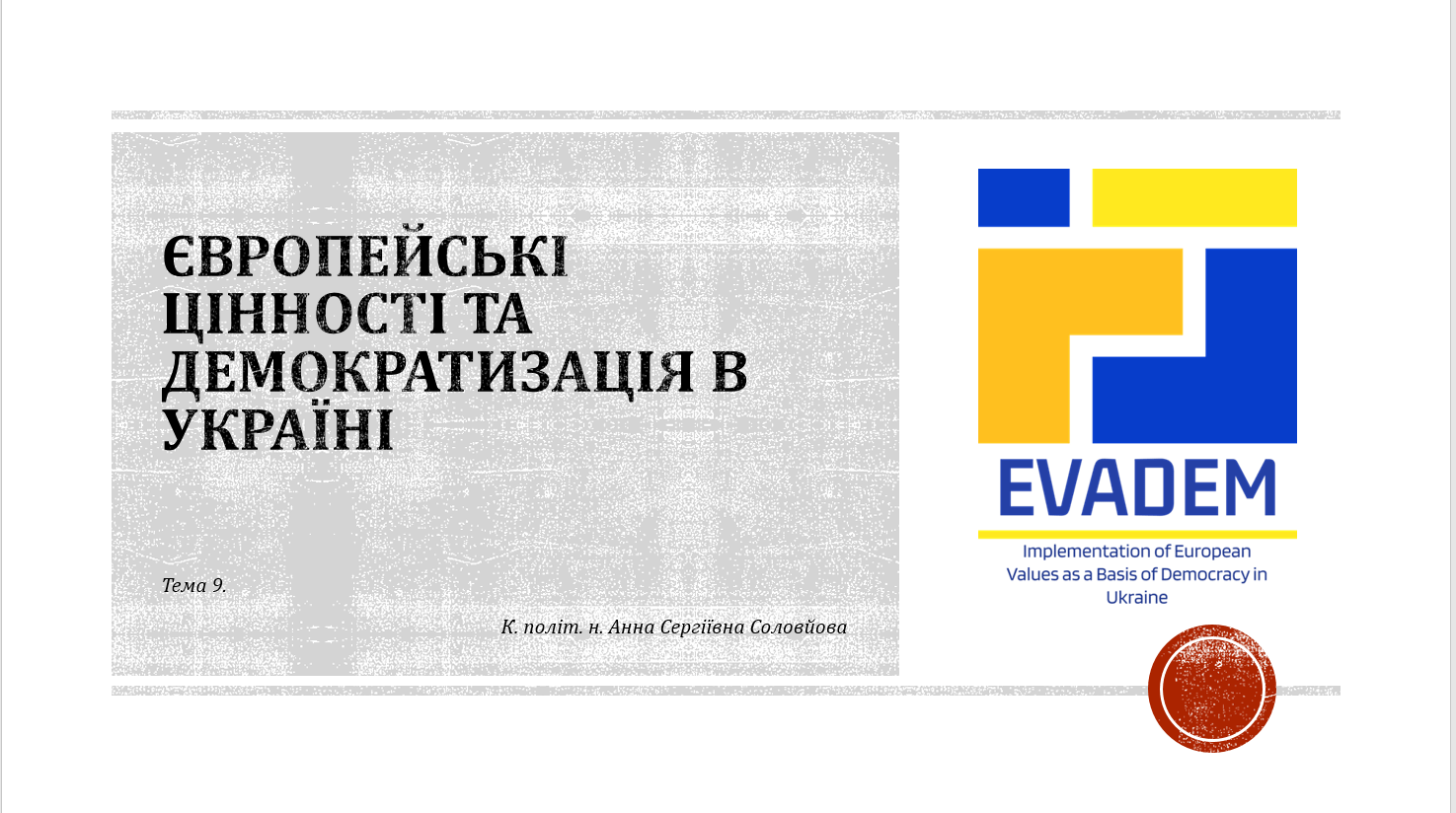 12 травня 2023 року кандидатка політичних наук, доцентка кафедри журналістики Чорноморського національного університету імені Петра Могили Анна Соловйова провела дев’яту, завершальну, лекцію «Європейські цінності та демократизація в Україні» циклу.